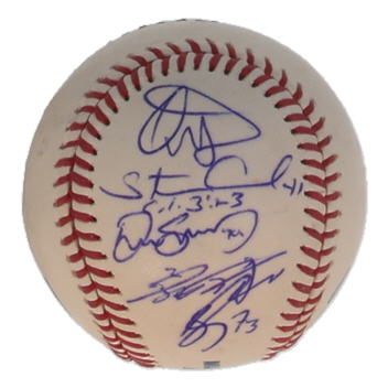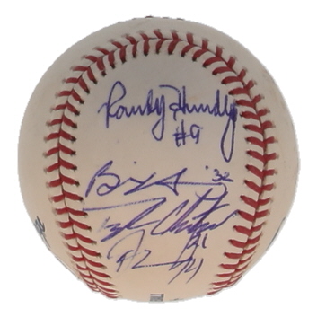 Rawlings Official Major League Baseball. Hand-signed and inscribed by Steve Cishek, Randy Hundley, Tyler Chatwood, Brian Duensing, Adbert Alzolay, Drew Smyly, Jen-Ho Tseng, Rob Zastryzny, and Oscar De La Cruz. Please note, there are stains and scuffing throughout the baseball.