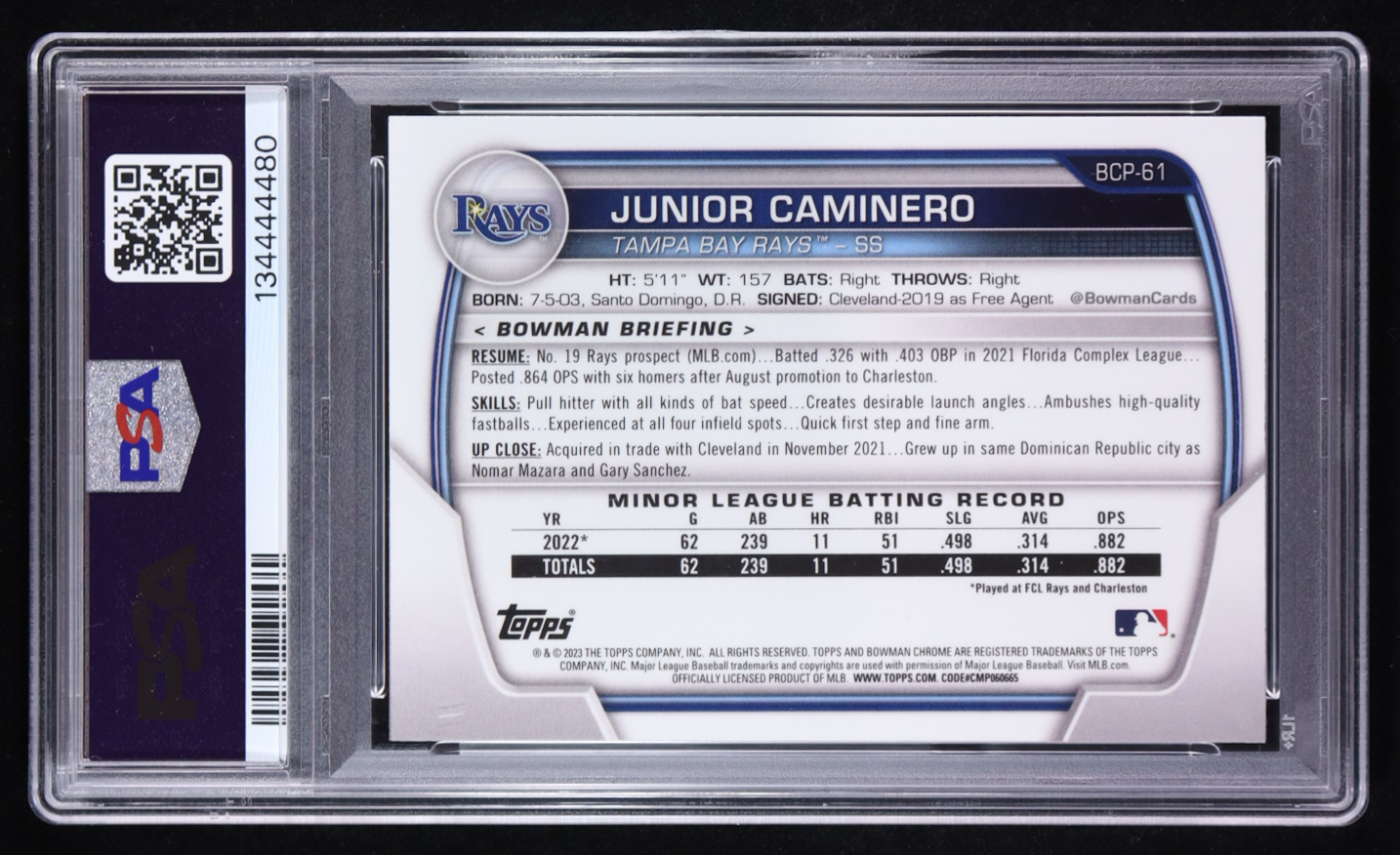 Junior Caminero Signed 2023 Bowman Chrome Prospects #BCP61 (PSA 9 | Autograph Grade 10)