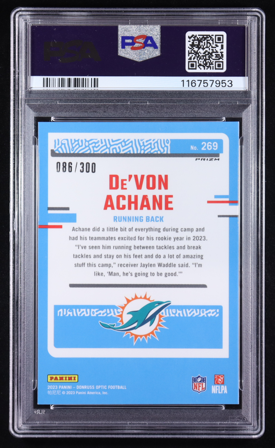 De'Von Achane 2023 Donruss Optic Wave #269 #086/300 RC (PSA 10)
