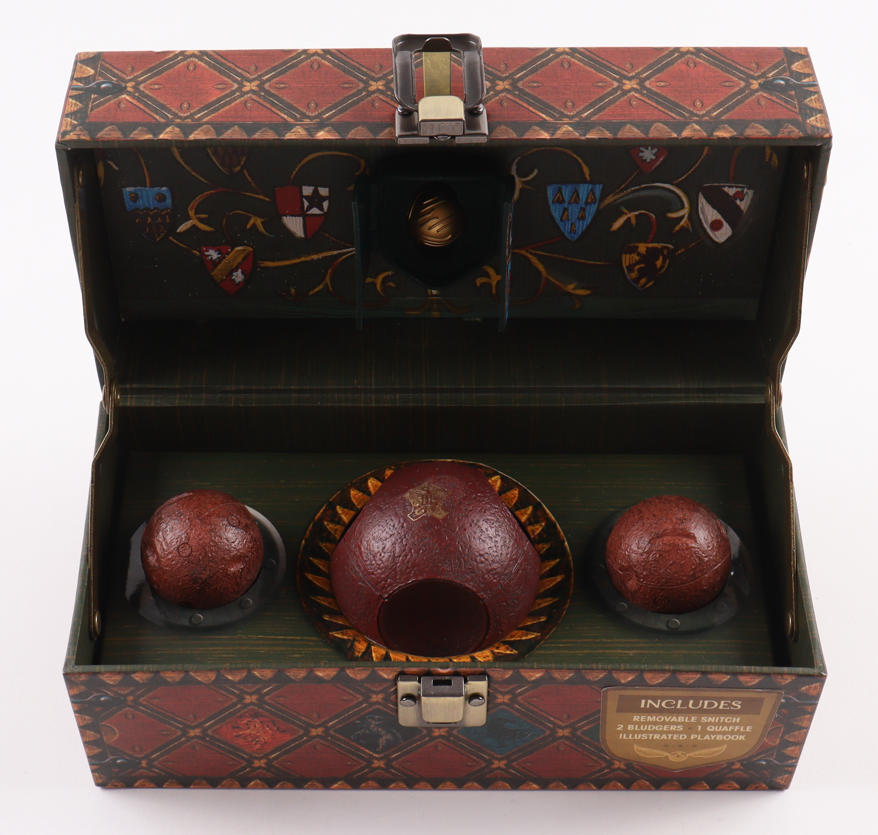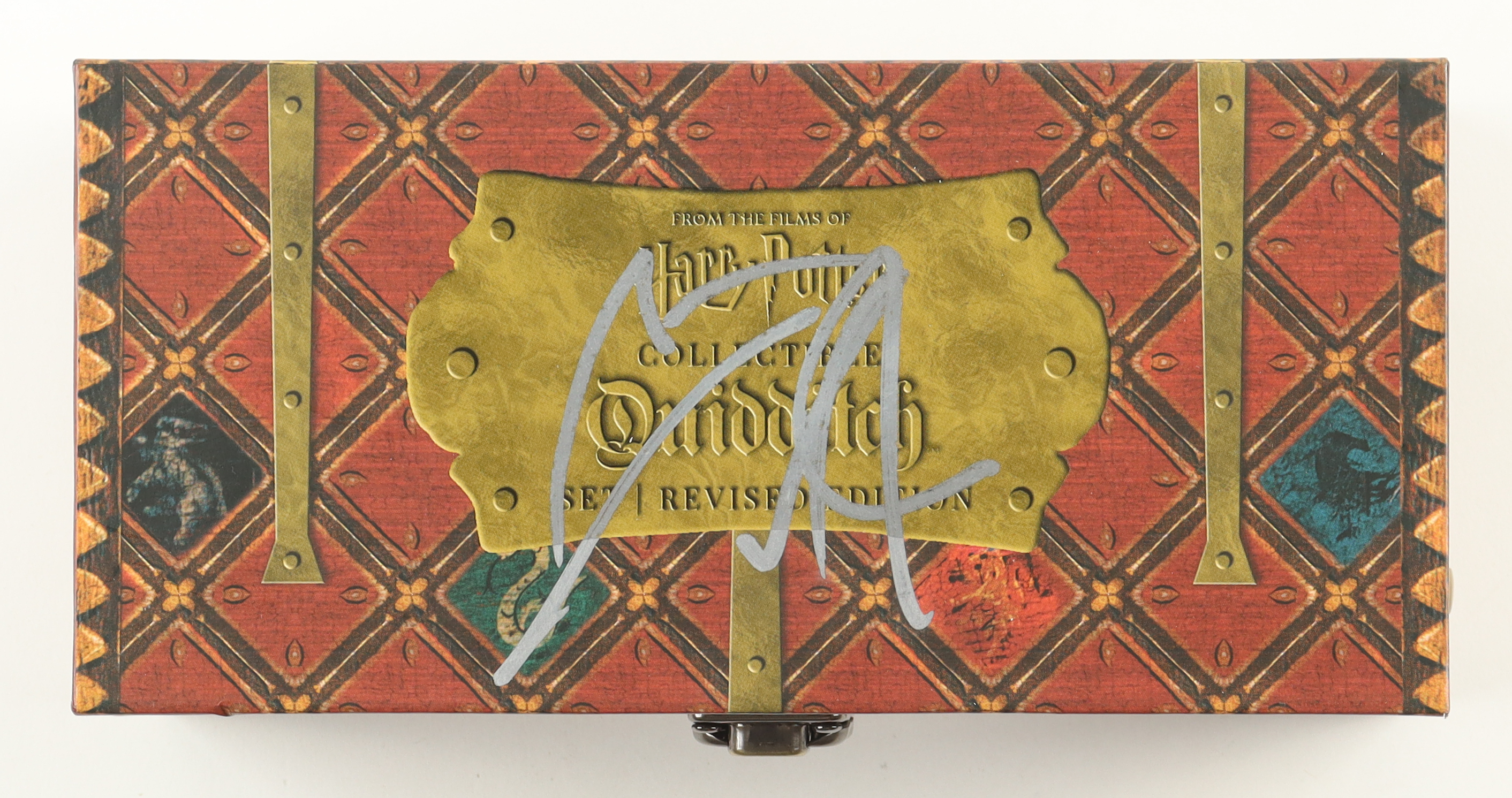 Collectible Quidditch Revised Set includes: removable Golden Snitch, 2 Bludgers, 1 Quaffle, Quidditch Playbook featuring key player profiles, rules of the game, and more complete with full-color photos and keepsake trunk modeled after the one seen in "Harry Potter and the Sorcerer's Stone" and has been hand-signed on the top of the packaging by Daniel Radcliffe.