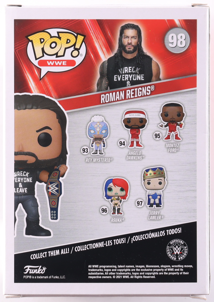 Funko Pop! vinyl figure measures approximately 4" in height and has been hand-signed on the packaging by Roman Reigns.