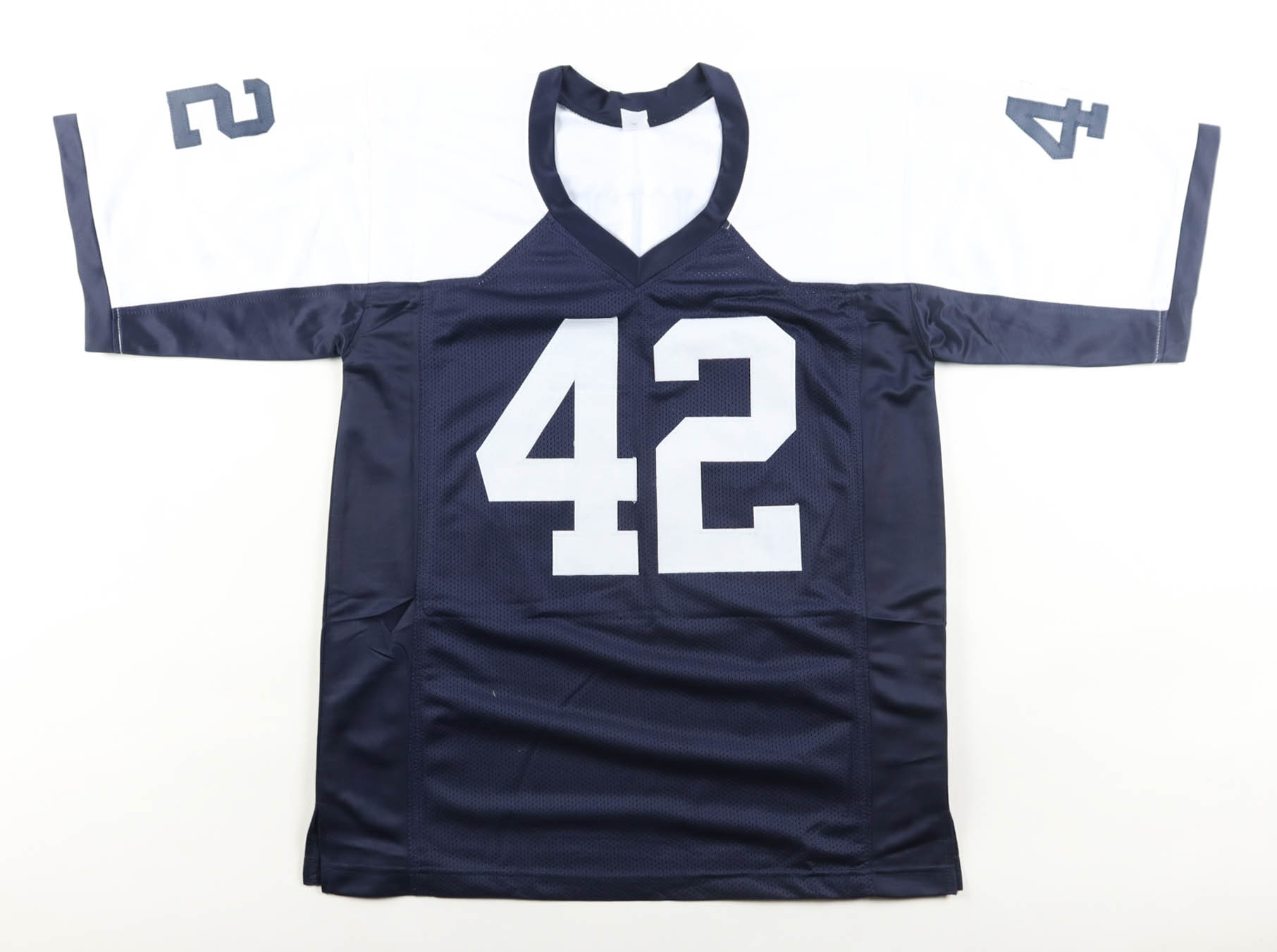 Custom jersey with everything sewn on, size XL. Hand-signed by Deuce Vaughn. Please note, there is blue staining on the sleeves and glue is visible through the numbers. See photos regarding the condition of the item.