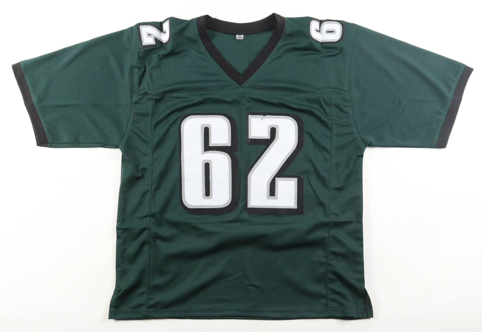 Custom jersey with everything sewn on, size XL. Hand-signed by Jason Kelce.