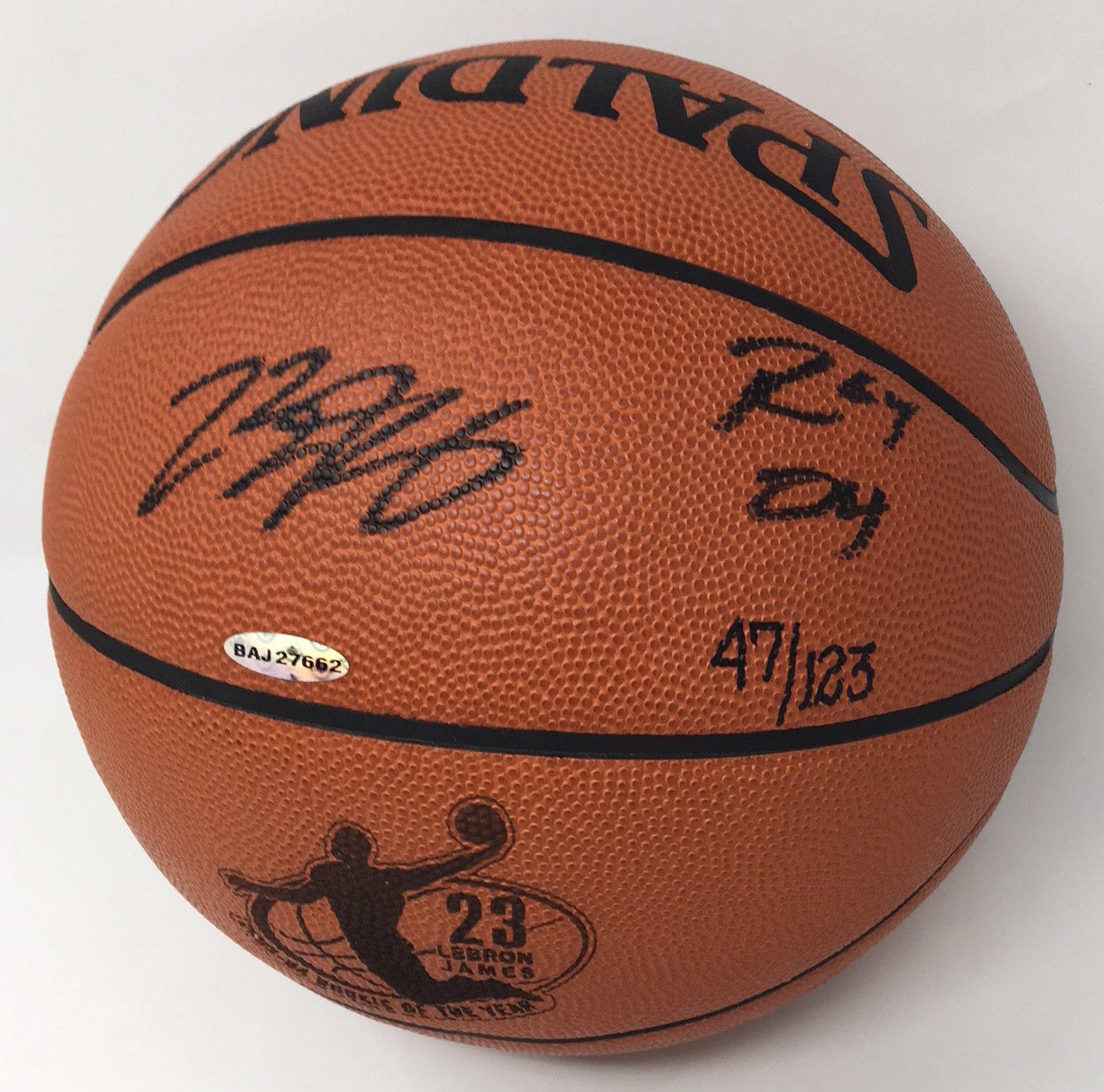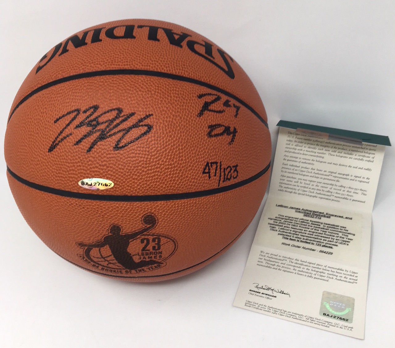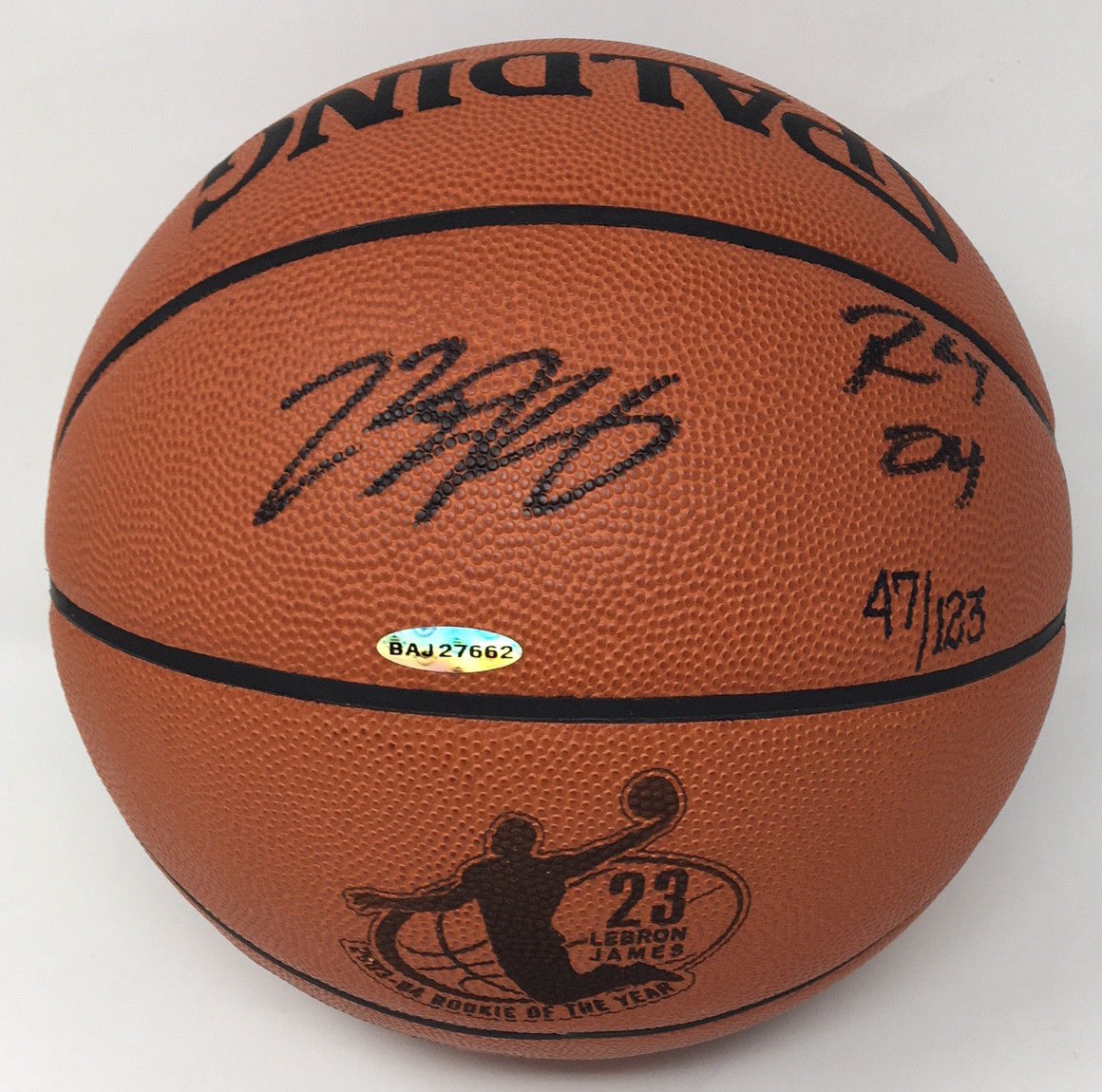 This is one of the hardest to find pieces of sports memorabilia signed by LeBron James. This is the original LeBron James signed and inscribed "ROY 04" authentic basketball. This item is limited to only 123 and the you will receive a random number from the edition. LeBron's silver paint pen signature is guaranteed authentic by virtue of UDA's Five-Step Authentication Process.