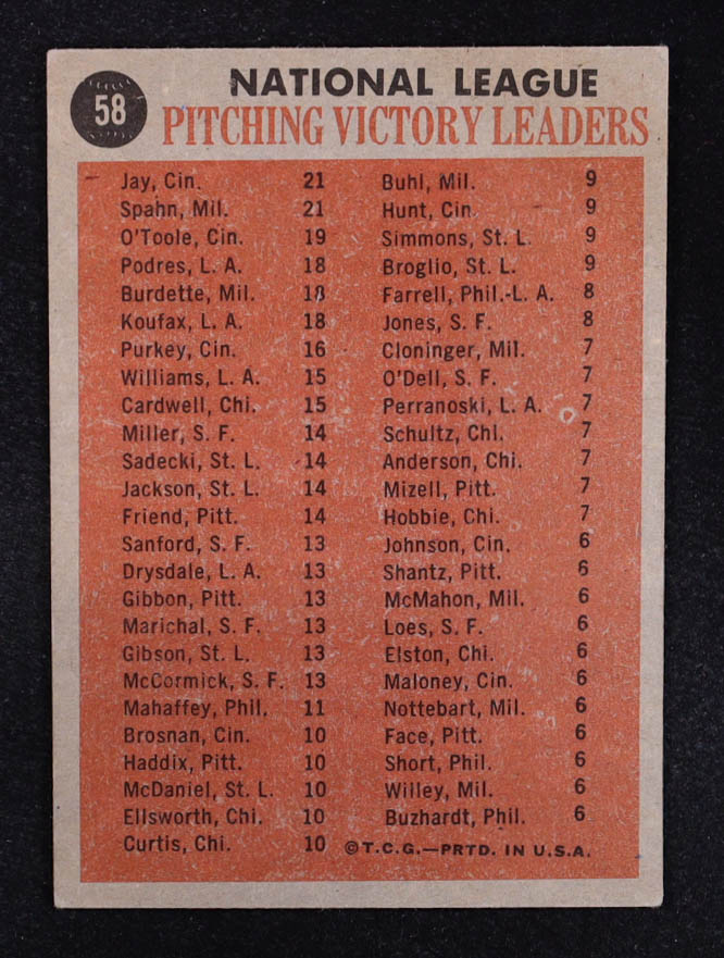 Warren Spahn / Joe Jay / Jim O'Toole 1962 Topps #58 NL Win Leaders