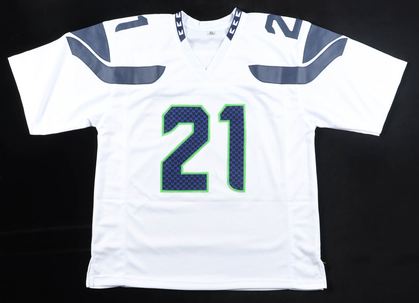 Custom jersey with everything sewn on, size XL. Hand-signed by Devon Witherspoon. Please note, there is a stain on the name plate.
