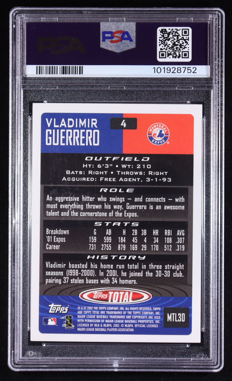 Vladimir Guerrero 2022 Archives Signature Series 2002 Topps Total #4 #1/1 (PSA 9)