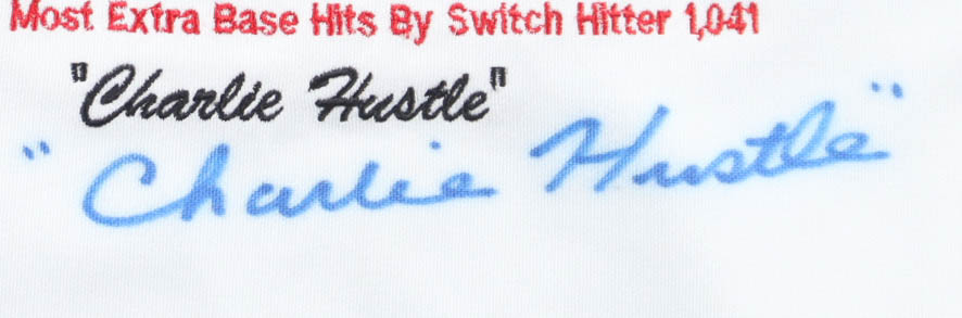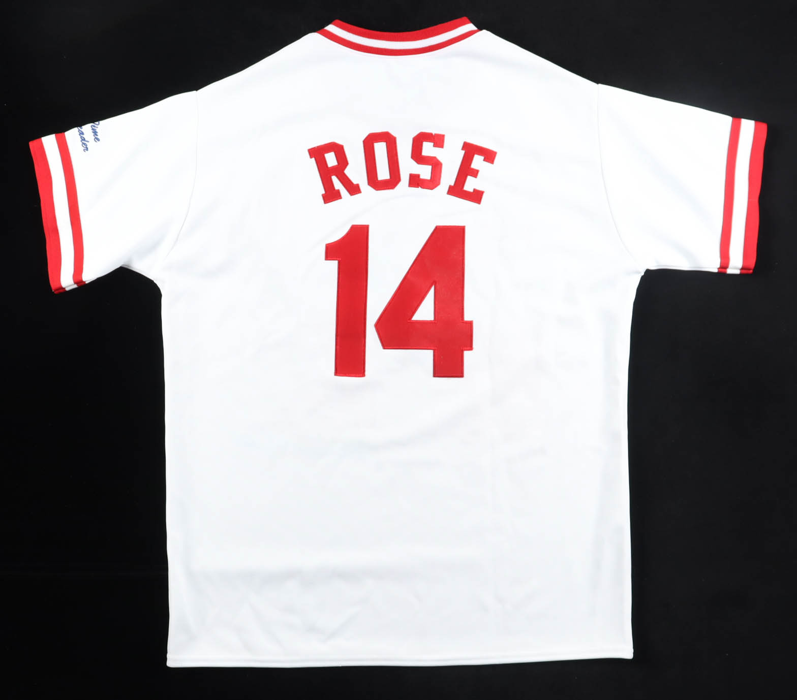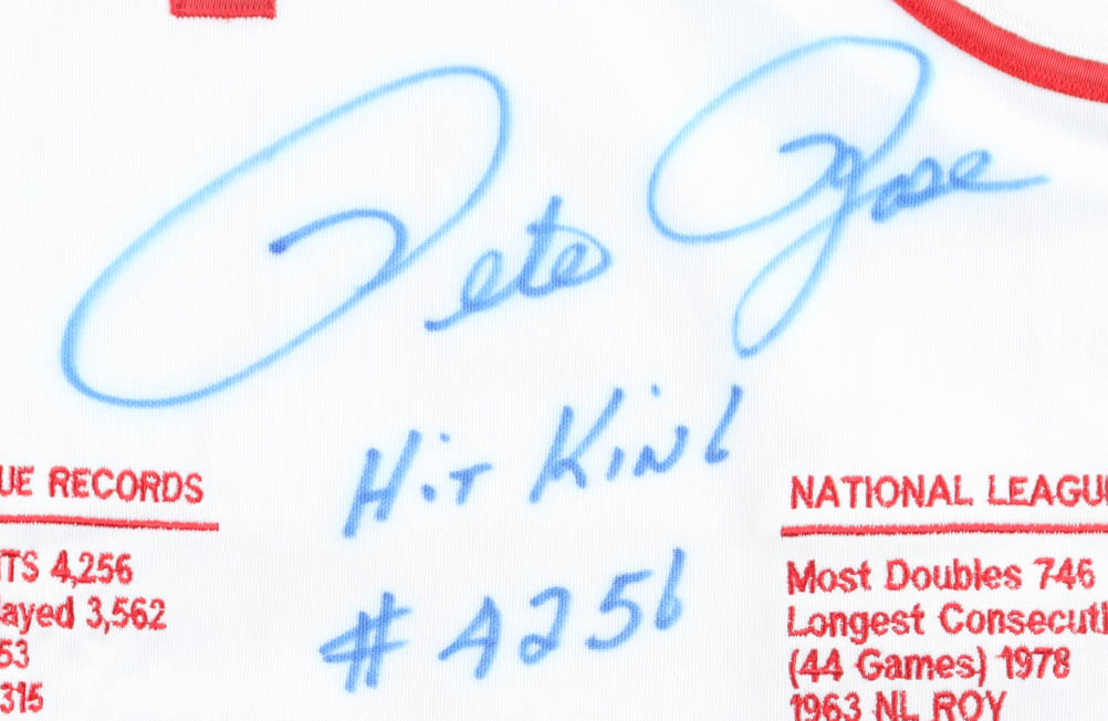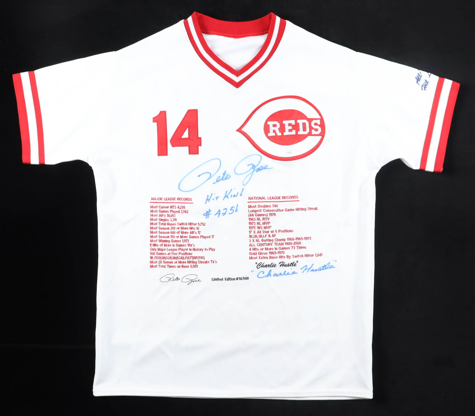 Custom jersey. Everything is sewn on, size XL. Hand-signed and inscribed by Pete Rose (D. 2024). Rose's career highlights have been custom stitched onto the front of the jersey below the team logo. The jersey is limited edition and is #14 / 500. Please note, the signature and inscriptions have bled.