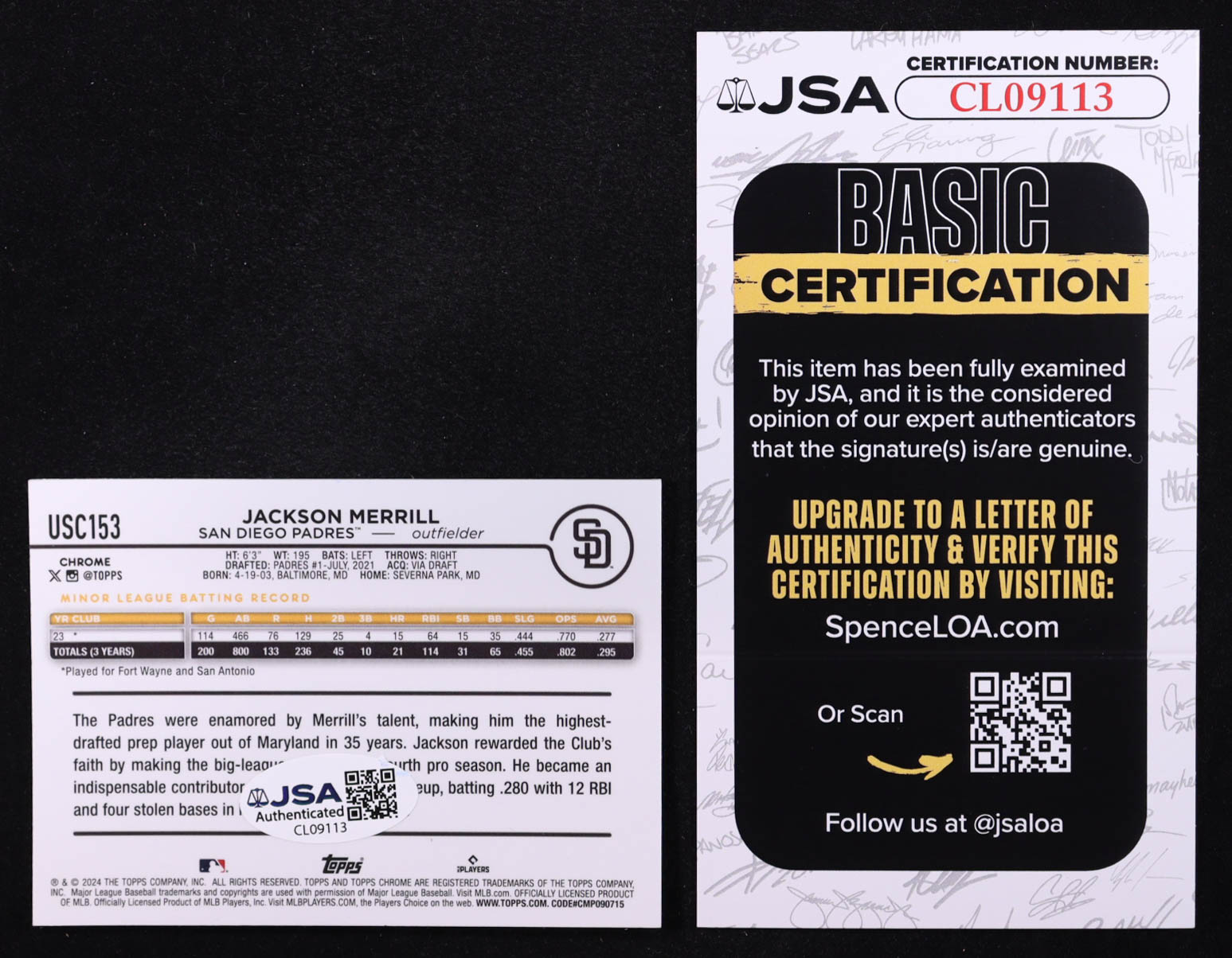 Card has been hand-signed by Jackson Merrill (San Diego Padres). Please see photos for more details regarding the condition of the card.