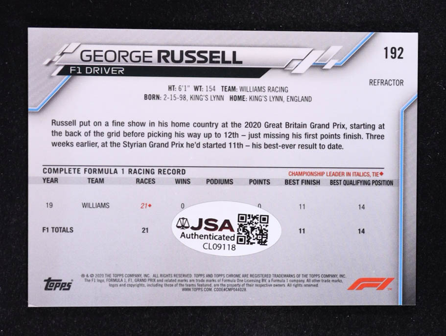 George Russell Signed 2020 Topps Chrome Formula 1 Refractors #192 RC