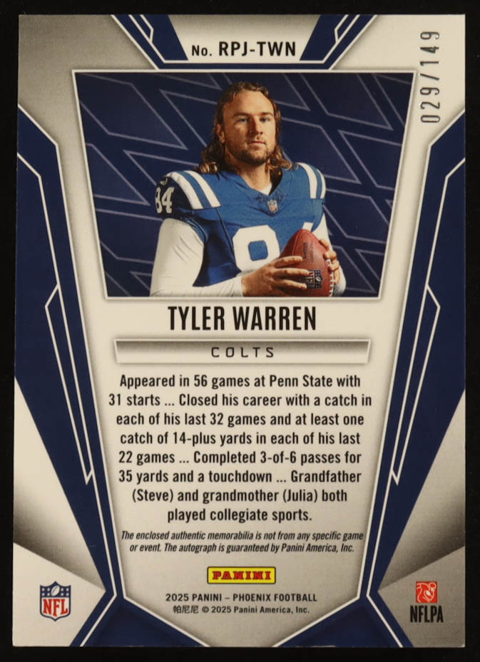 Tyler Warren 2025 Panini Phoenix Rookie Phenoms Jersey Autographs Silver #16 RC #029/149