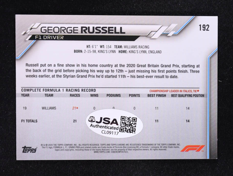 George Russell Signed 2020 Topps Chrome Sapphire Formula 1 #192 RC