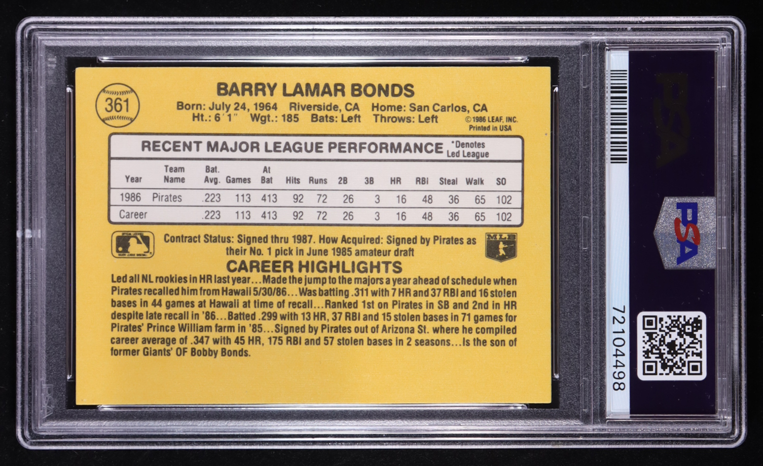 Barry Bonds 1987 Donruss #361 RC (PSA 9)