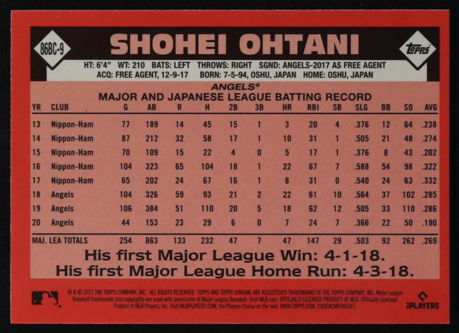 Shohei Ohtani 2021 Topps Chrome '86 Topps #86BC9