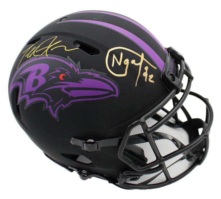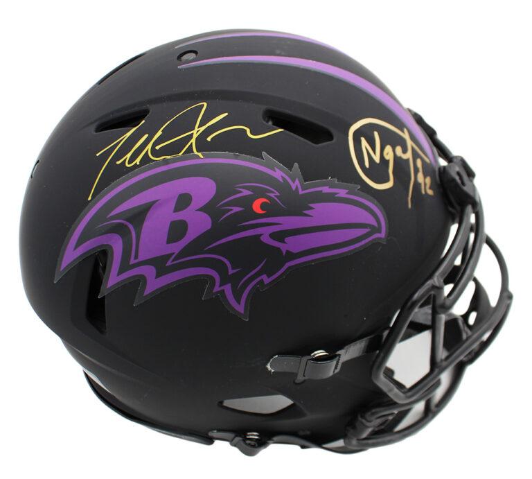 Riddell Baltimore Ravens full-size authentic on-field lunar eclipse alternate speed helmet has been hand-signed by Haloti Ngata and Terrell Suggs.
