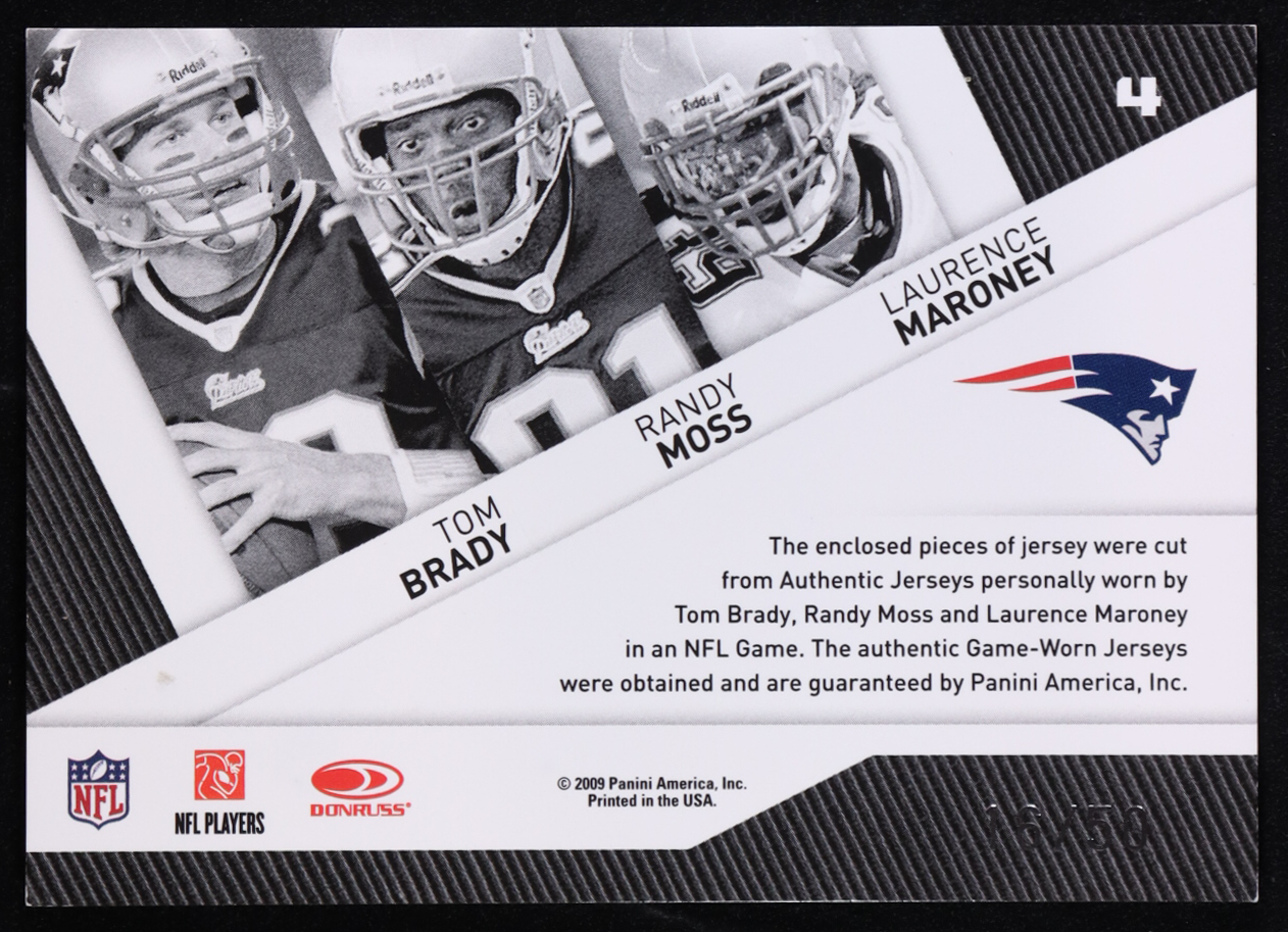Tom Brady / Randy Moss / Laurence Maroney 2009 Donruss Threads Triple Threat Materials Prime #4 #16/50