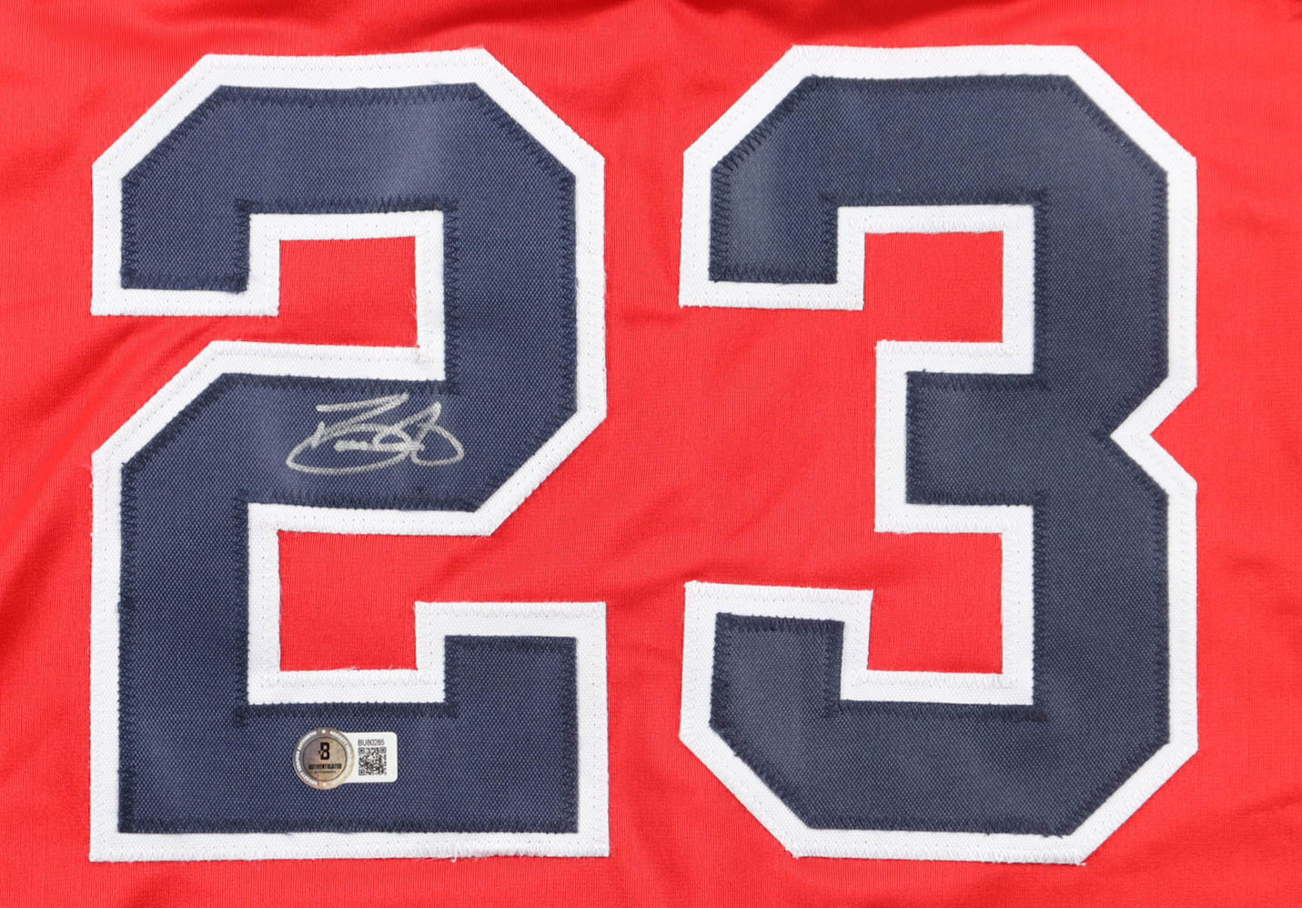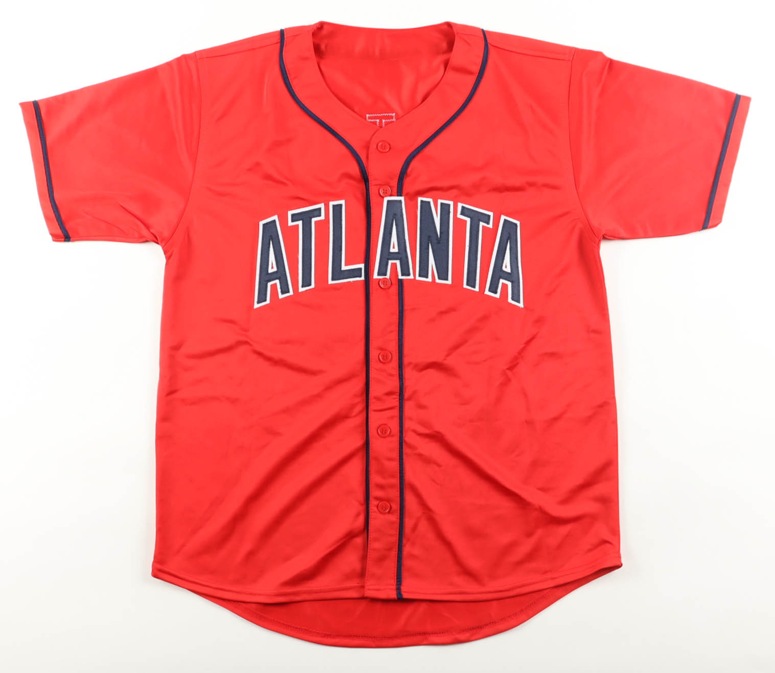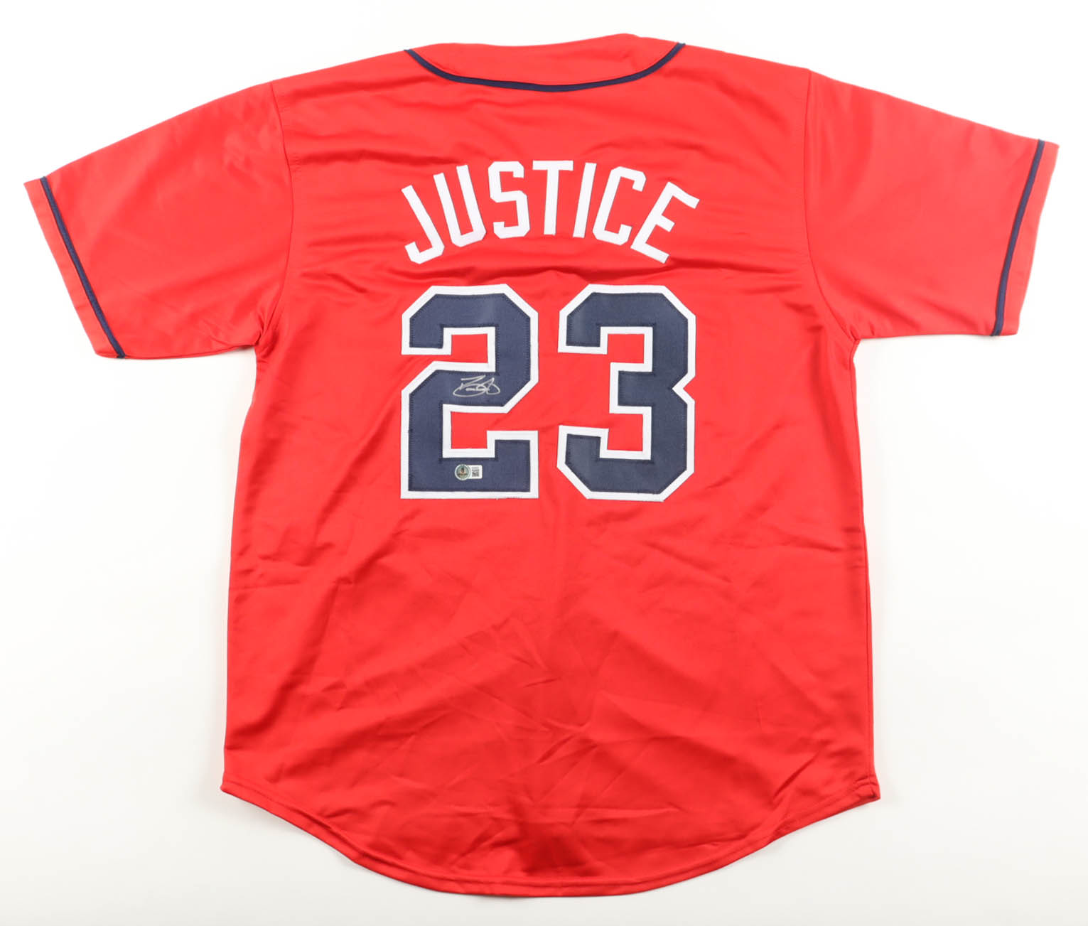 Custom jersey with everything sewn on, size XL. Hand-signed by David Justice.