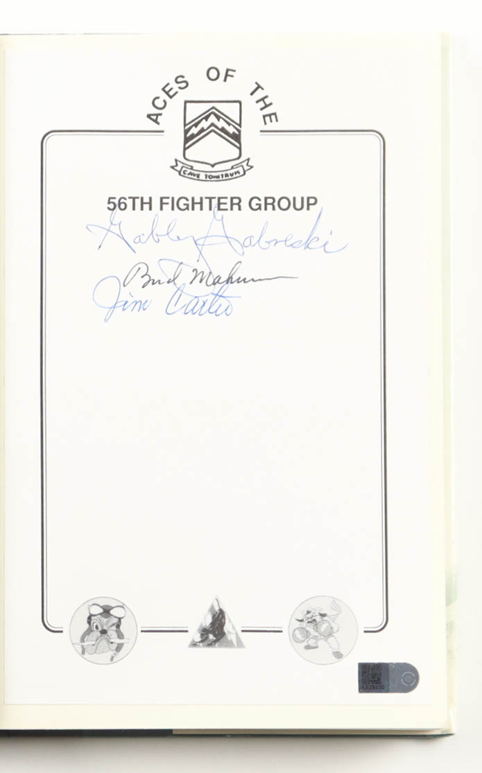 This hardbound *Special Edition of Gabby: A Fighter Pilot's Life* is an extraordinary collectible, featuring a specially inscribed bookplate hand-signed by three legendary WWII 56th Fighter Group Aces: Francis ""Gabby"" Gabreski, Jim Carter, and Walker ""Bud"" Mahurin. Authenticated by James Spence Authentication (JSA), this edition comes with a JSA Certificate of Authenticity and a JSA sticker affixed to the item, ensuring its provenance and historical significance.