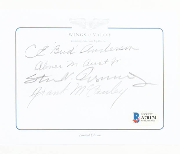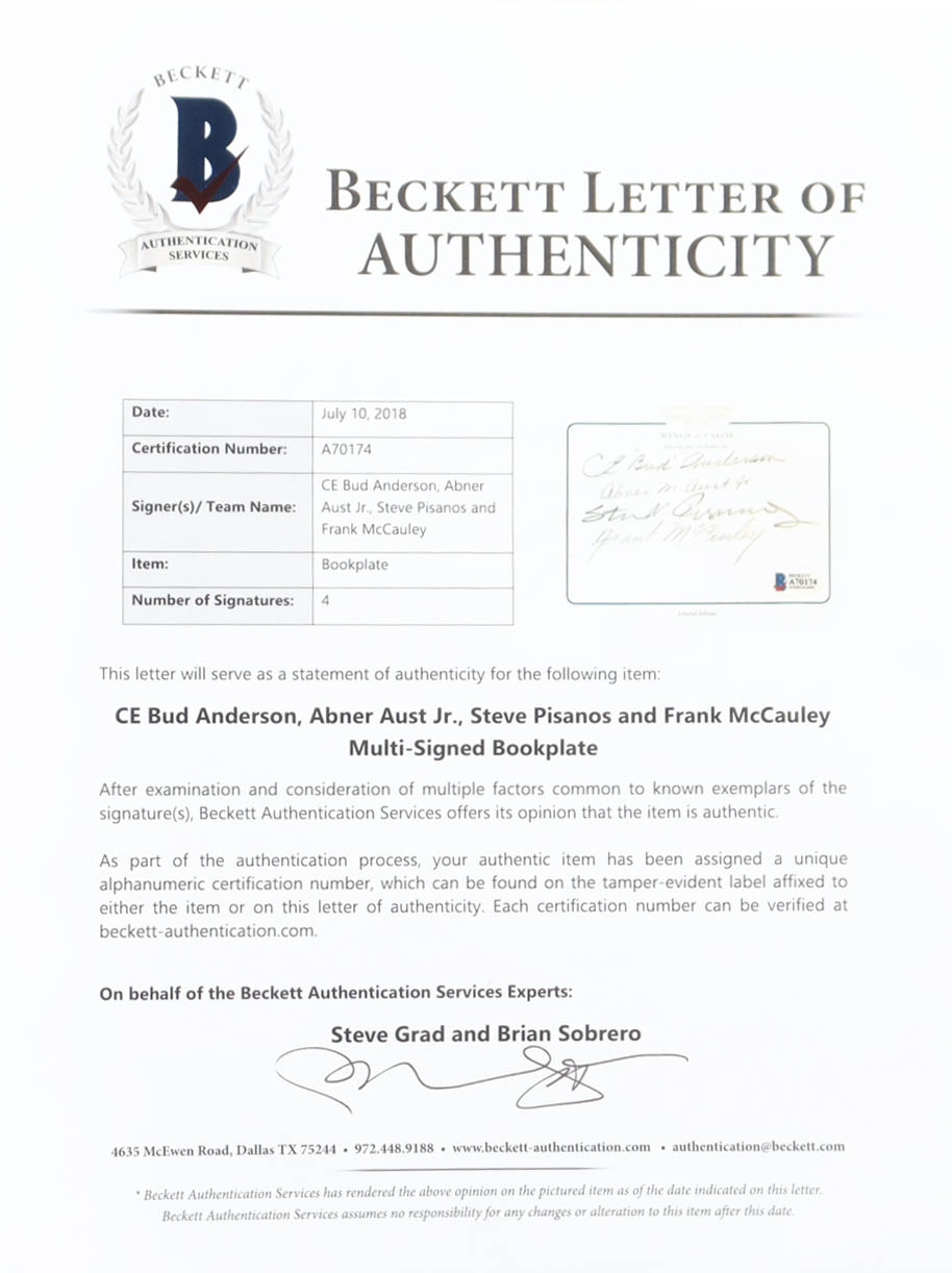 Hardcover book has been hand-signed on the inside cover page by Bud Anderson, Abner Aust Jr., Steve Pisanos, and Frank McCauley.