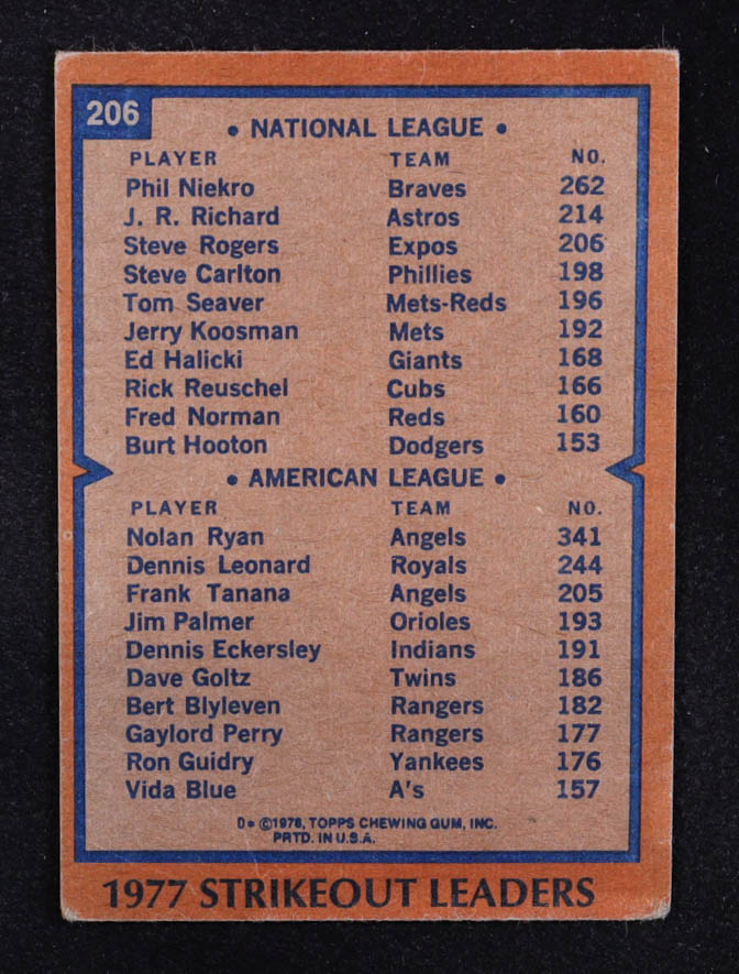 Phil Niekro / Nolan Ryan 1978 Topps #206 Strikeout Leaders DP