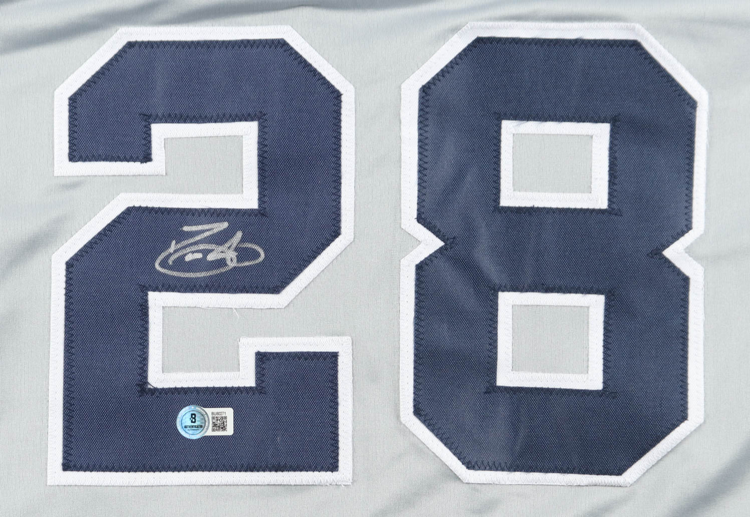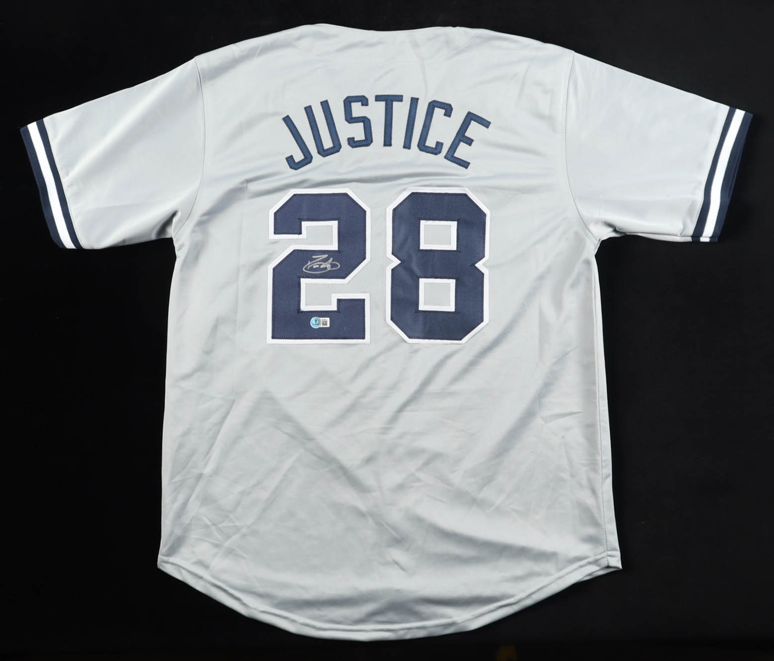 Custom jersey with everything sewn on, size XL. Hand-signed by David Justice.