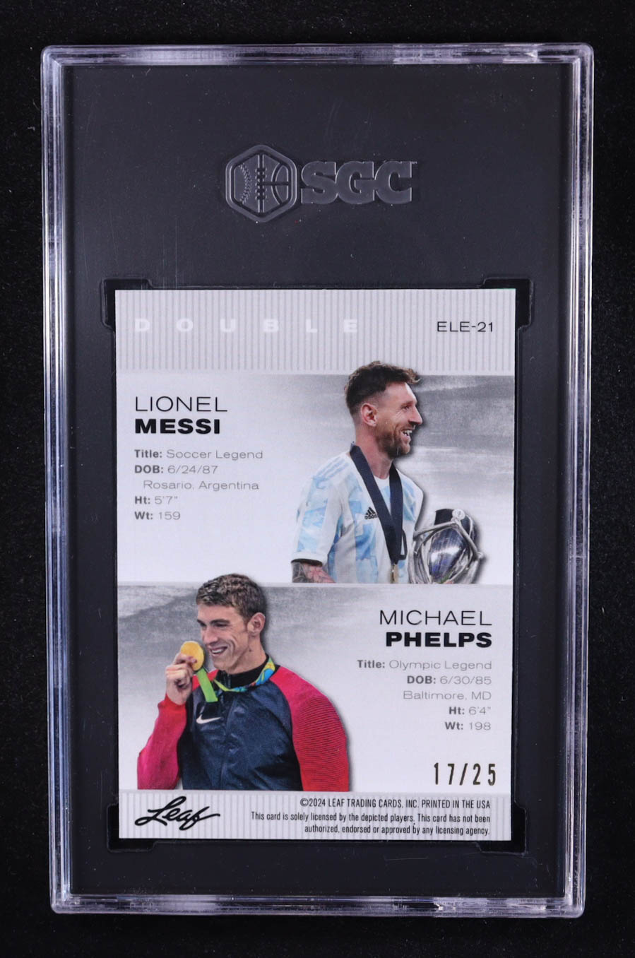 Lionel Messi / Michael Phelps 2024 Leaf Special Release Metal Exclusive Legends Edition Double Silver Wave #ELE-21 #17/25 (SGC 10)
