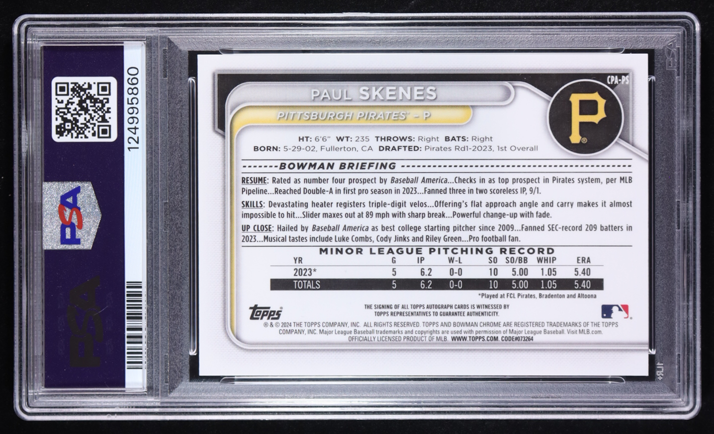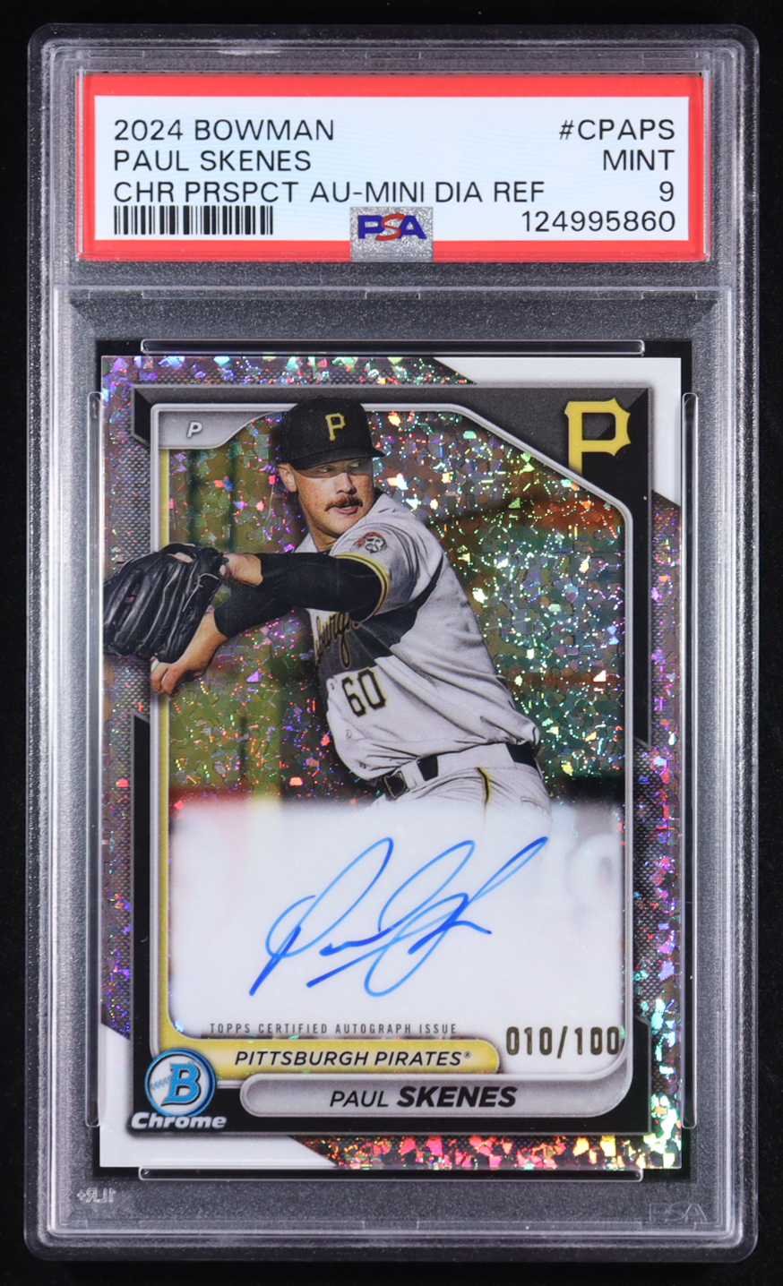 Paul Skenes 2024 Bowman Chrome Prospect Autographs Mini-Diamond Refractors #CPAPS #010/100 RC (PSA 9)