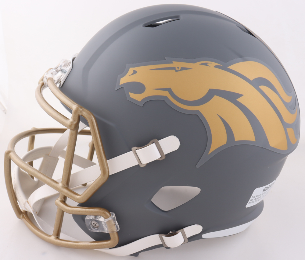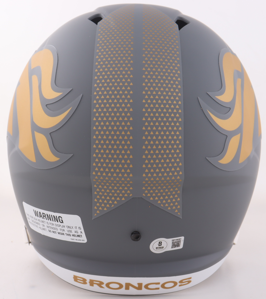 Riddell Denver Broncos Full-Size Slate Alternate replica speed helmet has been hand-signed and inscribed by Bill Romanowski.