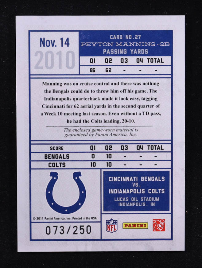Peyton Manning 2011 Timeless Treasures Game Day Souvenirs 2nd Quarter #27 #073/250
