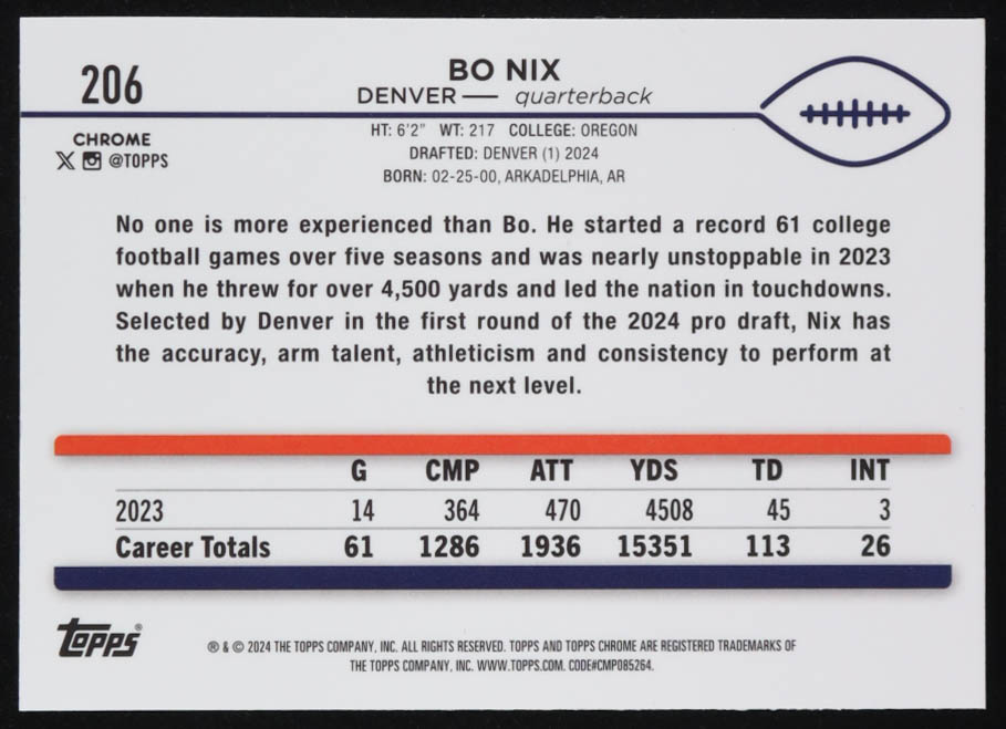 Bo Nix 2024 Topps Chrome Prism Refractors #206 RC