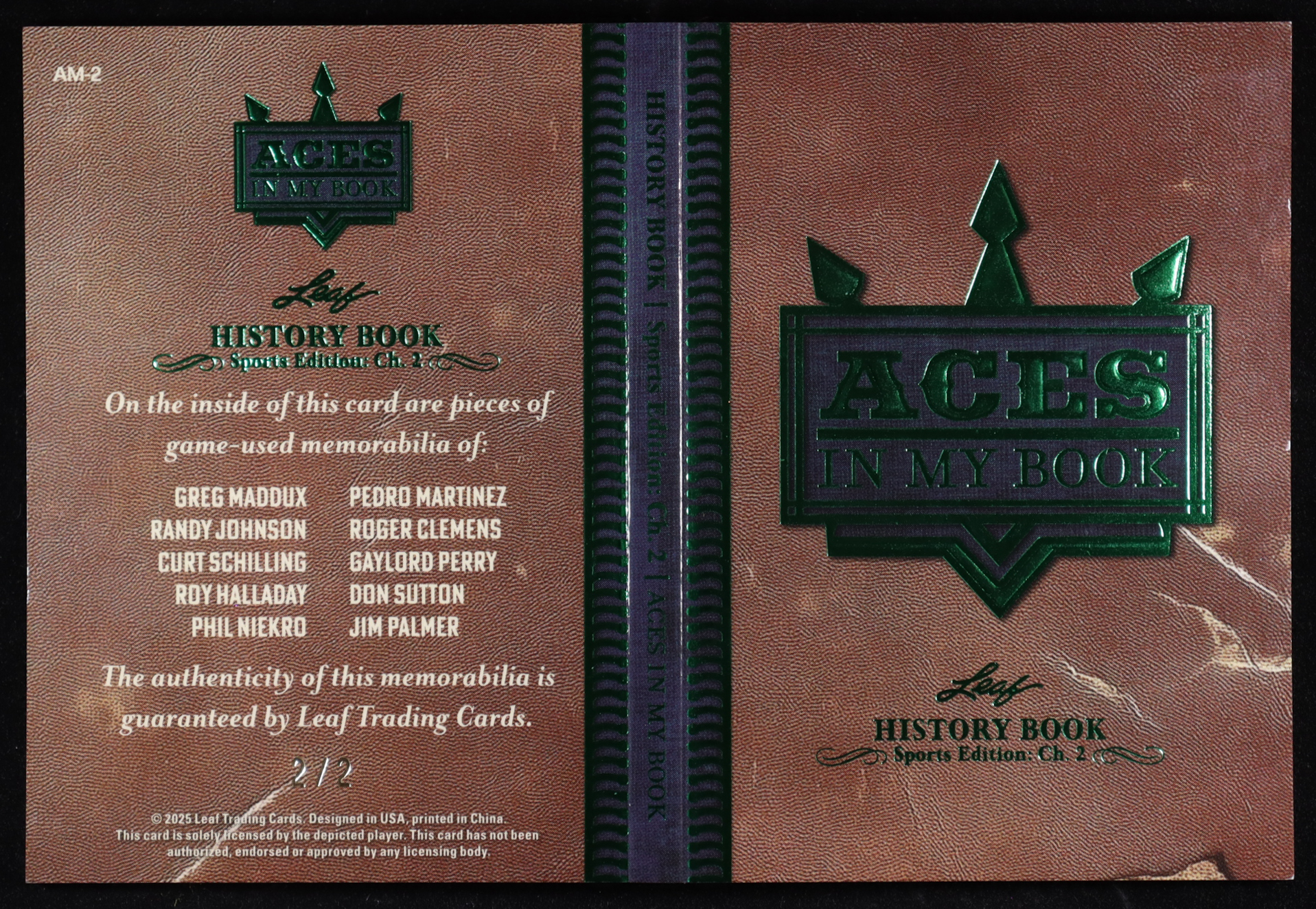 2025 Leaf History Book Sports Edition Chapter Two Aces In My Book Green #AM2 #2/2 Greg Maddux / Pedro Martinez / Randy Johnson / Roger Clemens / Curt Schilling / Gaylord Perry / Roy Halladay / Don Sutton / Phil Niekro / Jim Palmer