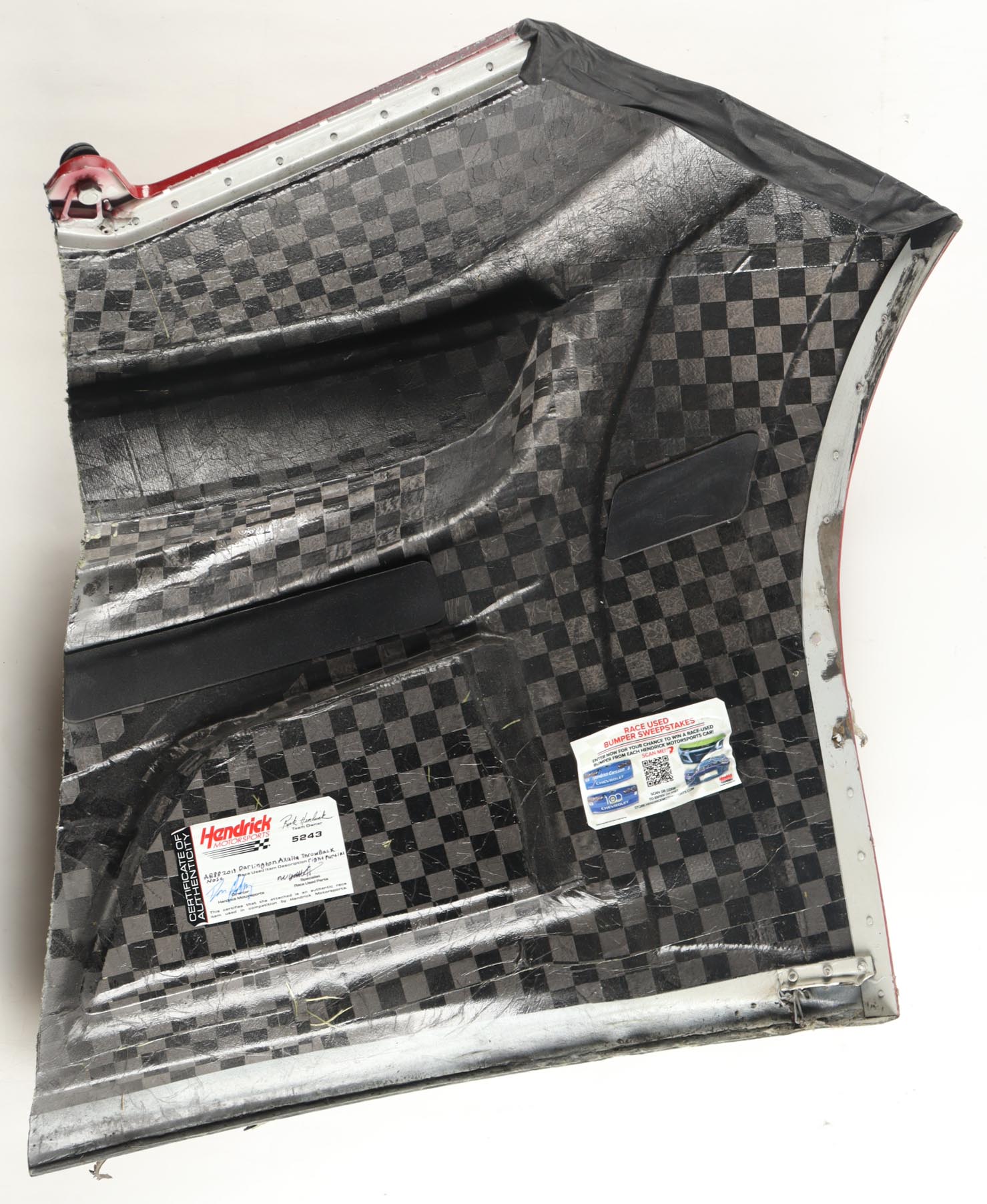 Race-Used Partial Right Nose Car Piece from Alex Bowman's #88 Axalta Throwback used during the 2019 Darlington. Authenticated by the Director and Race Used Parts Specialist at Hendrick Motorsports.
