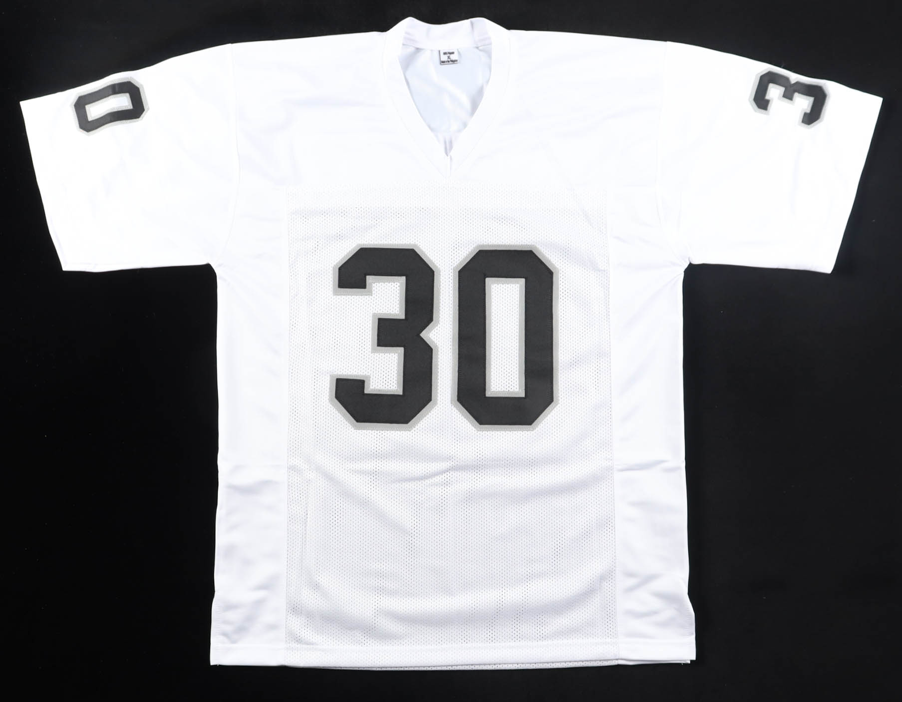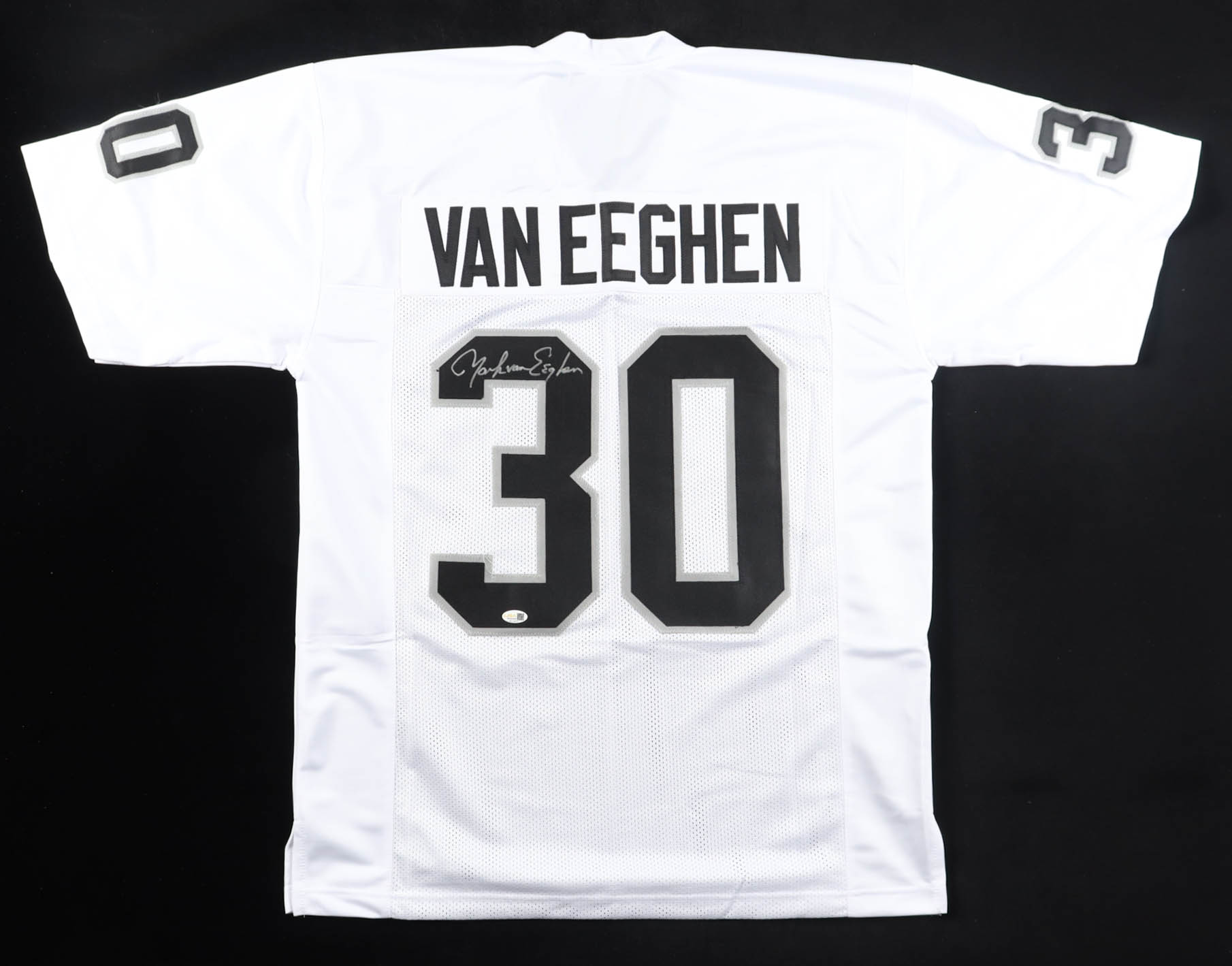 Custom jersey with everything sewn on, size XL. Hand-signed by Mark Van Eeghen.