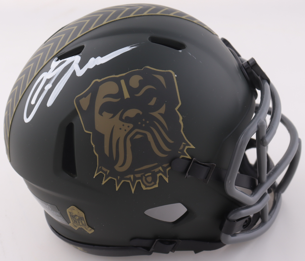 Riddell Cleveland Browns Salute to Service Alternate Speed Mini Helmet. Hand-signed by Carson Schwesinger. See photos for more details.