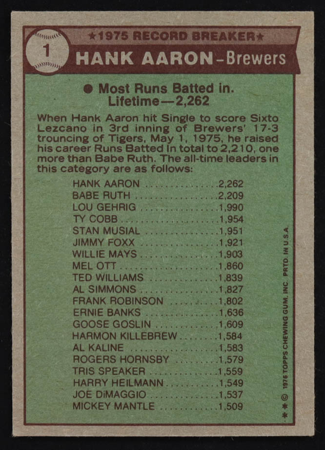 Hank Aaron 1976 Topps #1 RB
