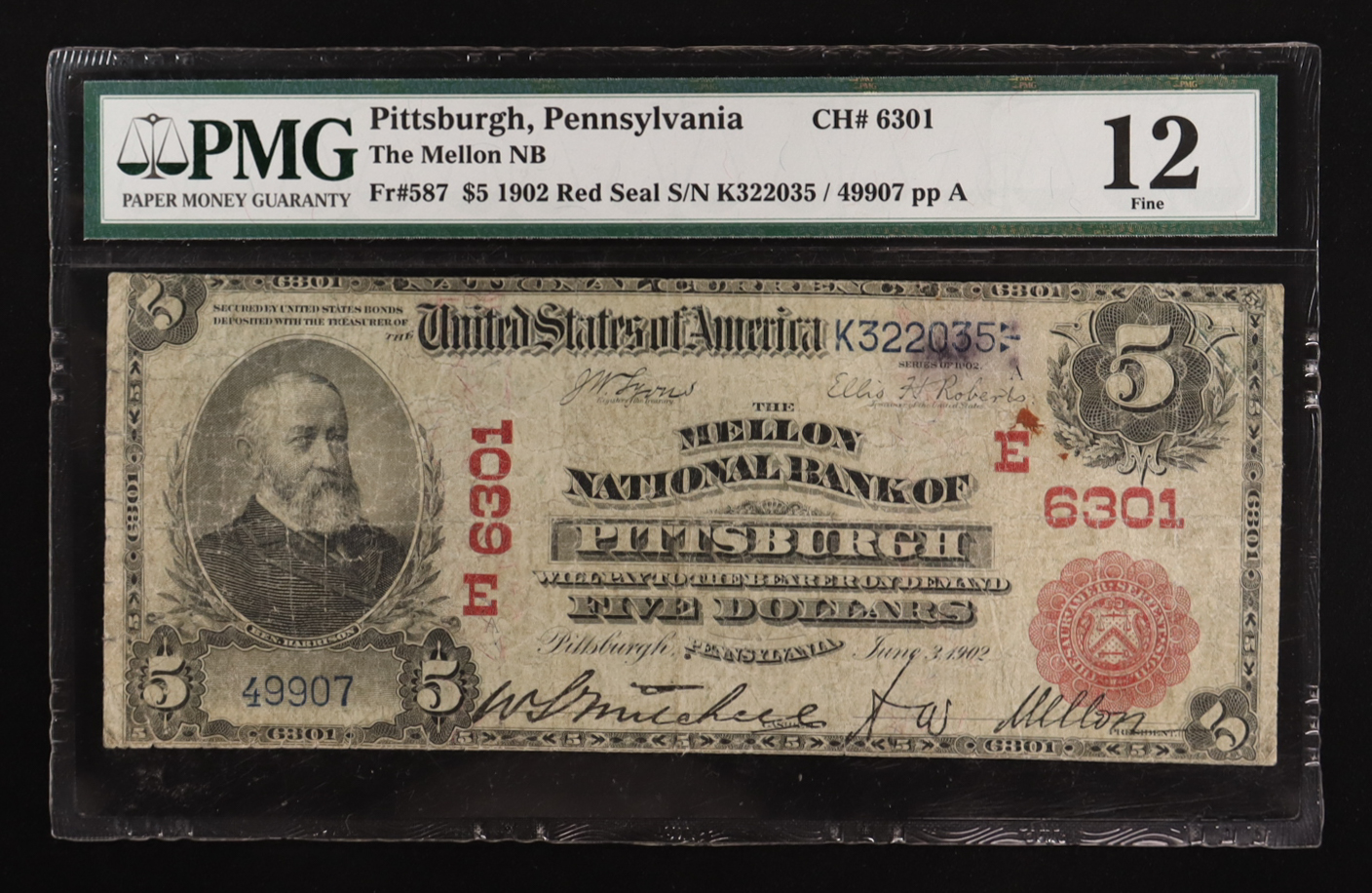 1902 United States The Mellon National Bank of Pittsburgh $5 Five Dollar Red Seal National Bank Note (PMG F 12)