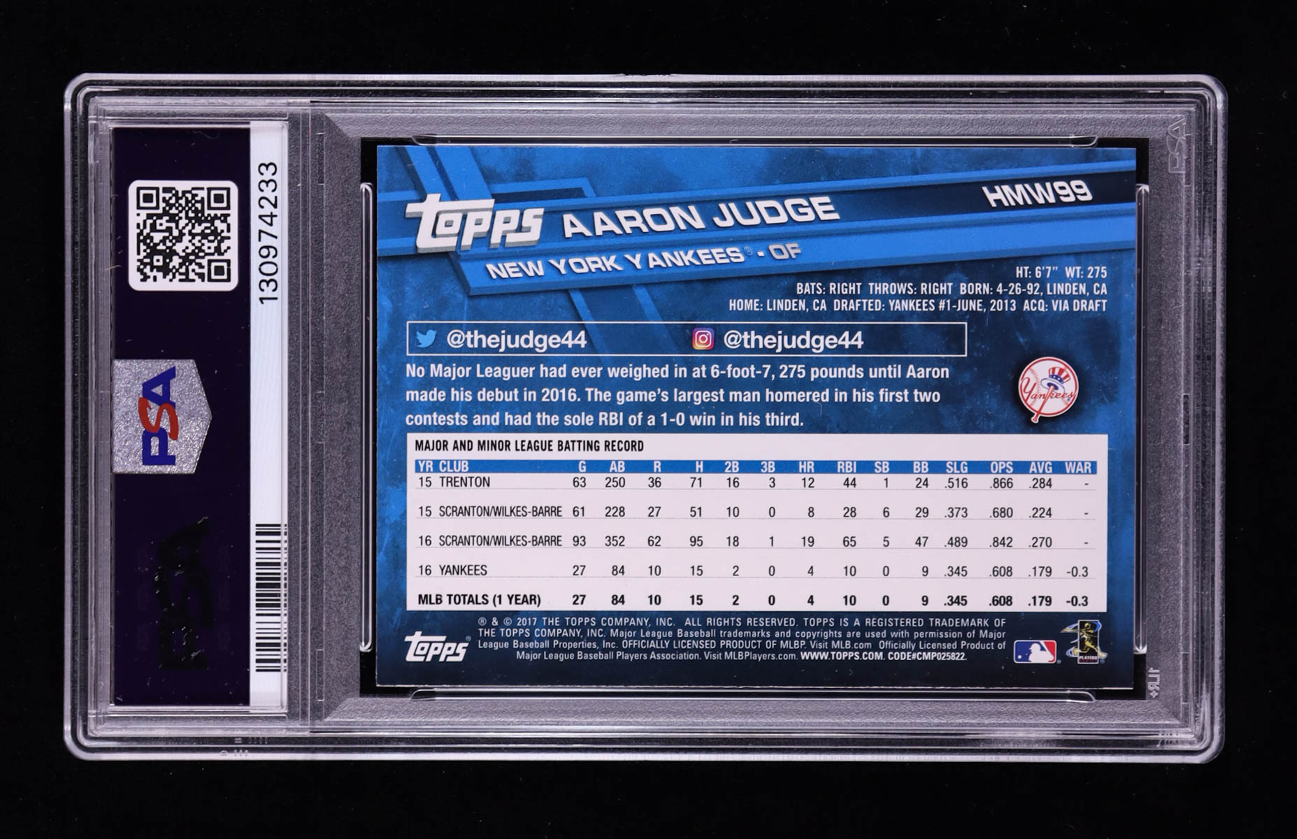 Aaron Judge 2017 Topps Walmart Holiday Snowflake #HMW99 RC (PSA 9)
