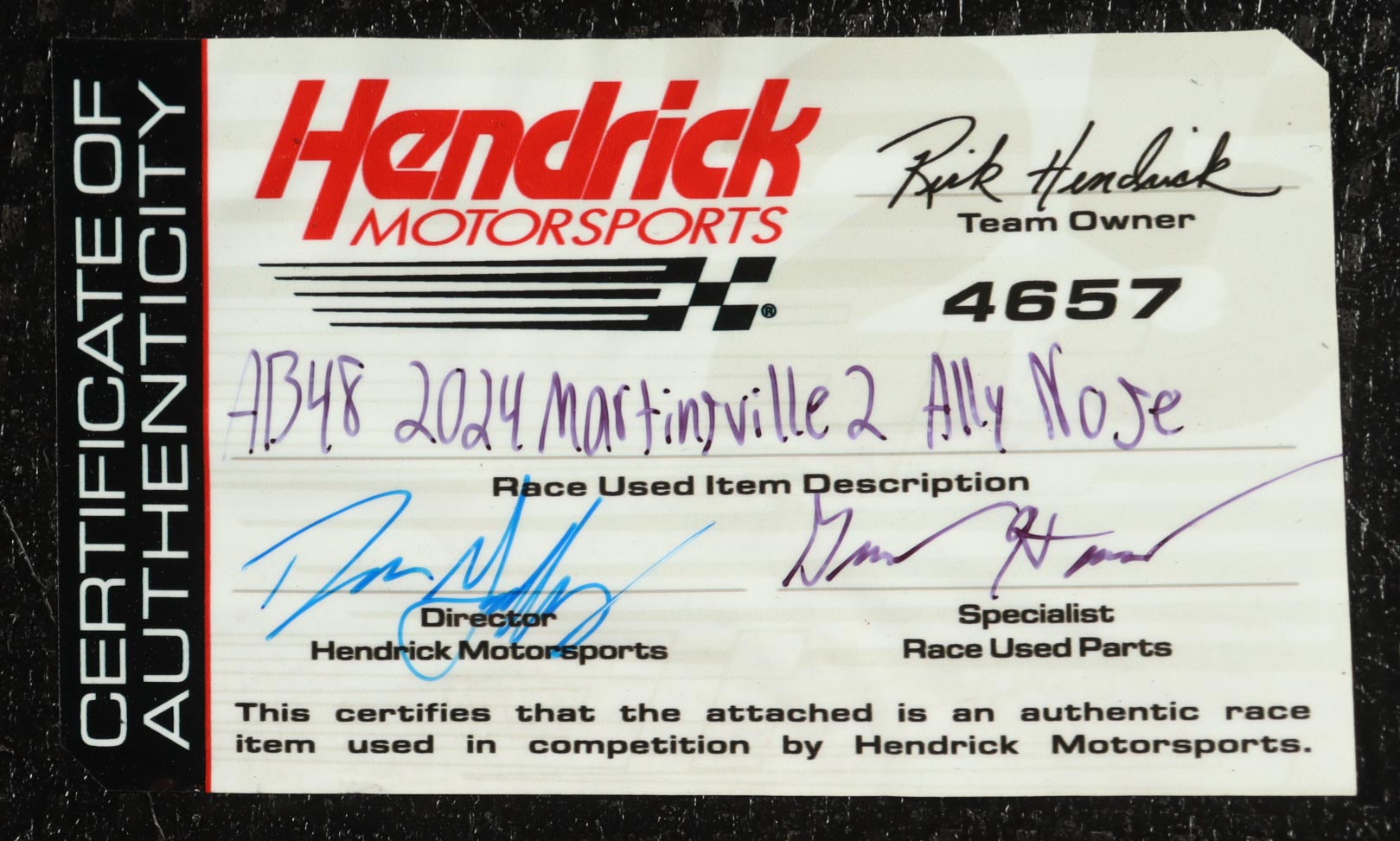 Race-Used Partial Right Nose Car Piece from Alex Bowman's #48 Ally used during the 2024 Martinsville Speedway. Authenticated by the Director and Race Used Parts Specialist at Hendrick Motorsports.