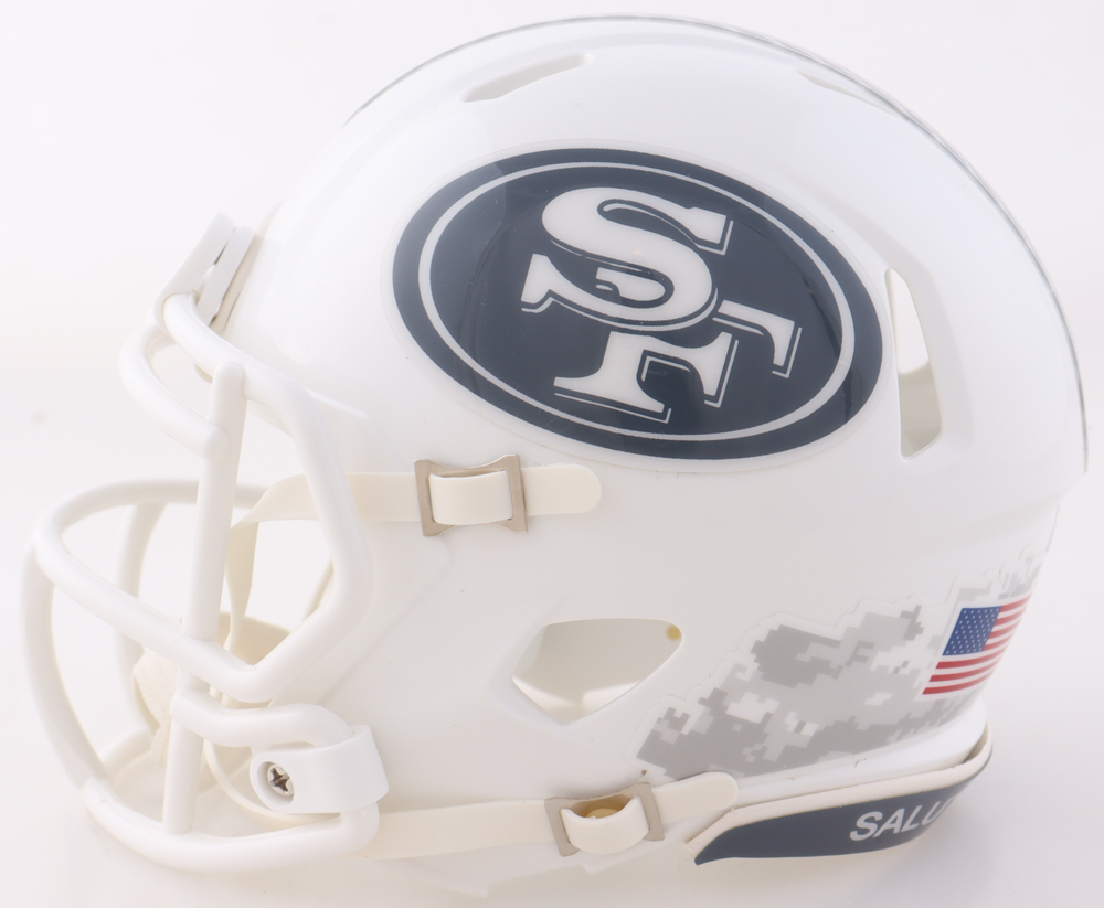 Riddell San Fransisco 49ers Salute To Service Alternate speed mini helmet has been hand-signed by Jeff Garcia.