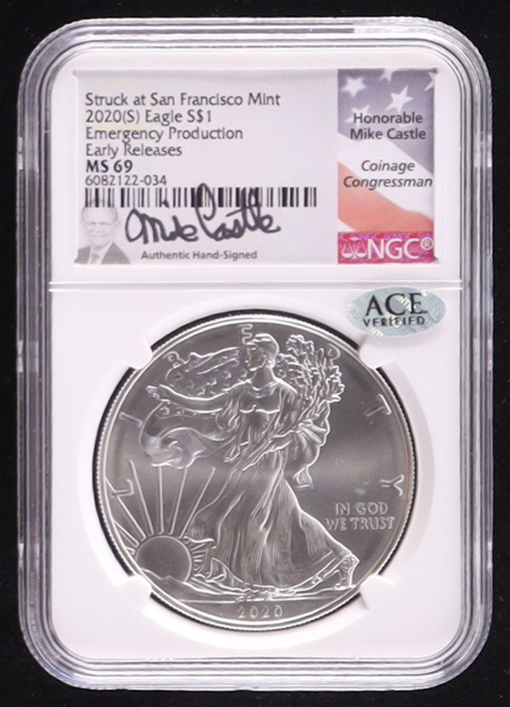 2020-(S) American Silver Eagle - Emergency Production Early Releases - Hand-Signed by Congressman Mike Castle (NGC MS69)