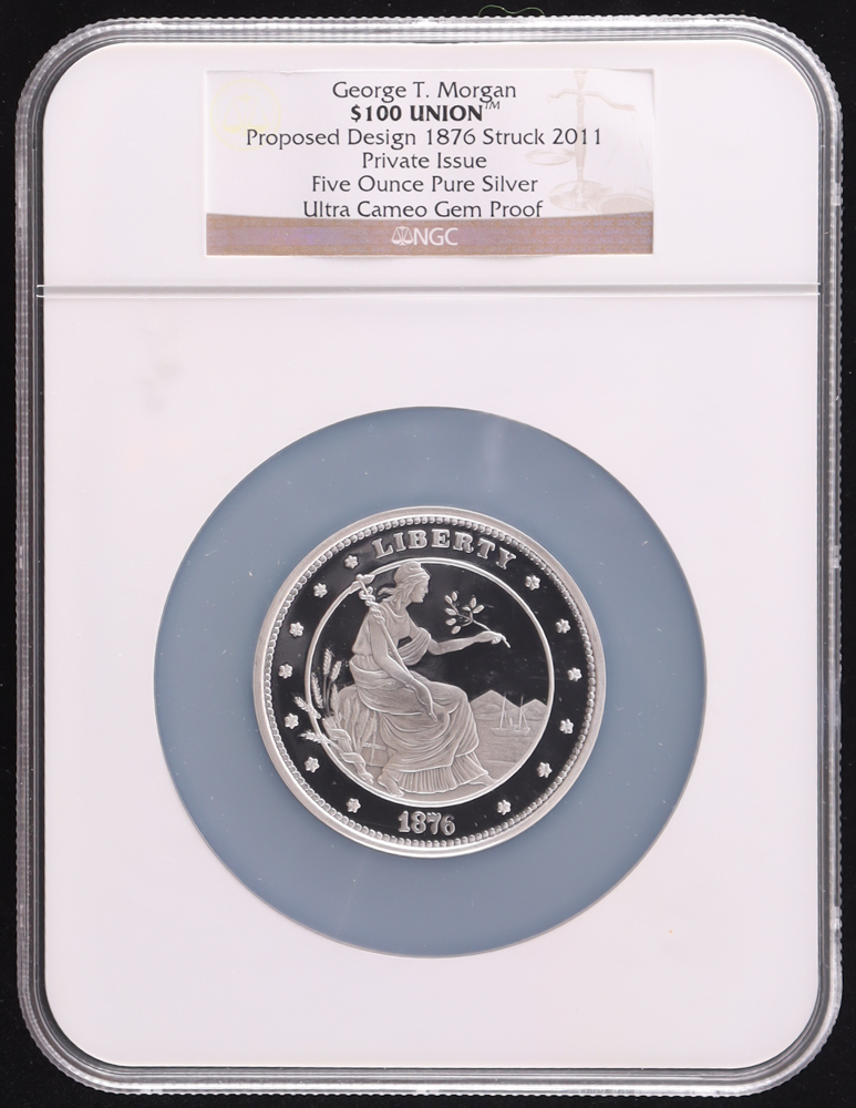 George T. Morgan $100 Union - Proposed Design 1876, Struck 2011 - Private Issue - 5 Oz Pure Silver Bullion Round (NGC Ultra Cameo Gem Proof)