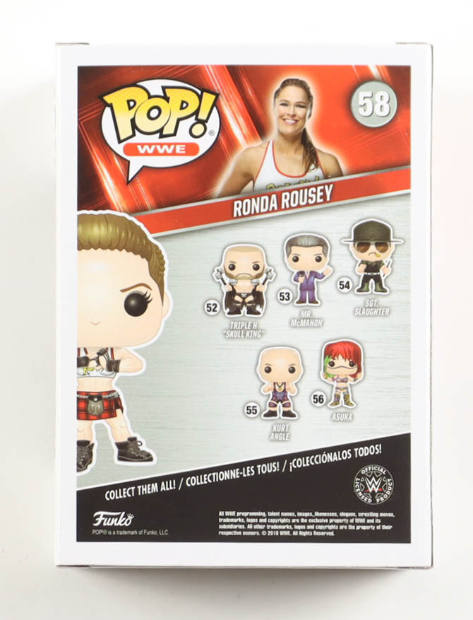 Vinyl figure measures approximately 4" tall and has been hand-signed by Ronda Rousey (HOF). Please note, item has been window swapped and there are creases on the corners of the packaging.