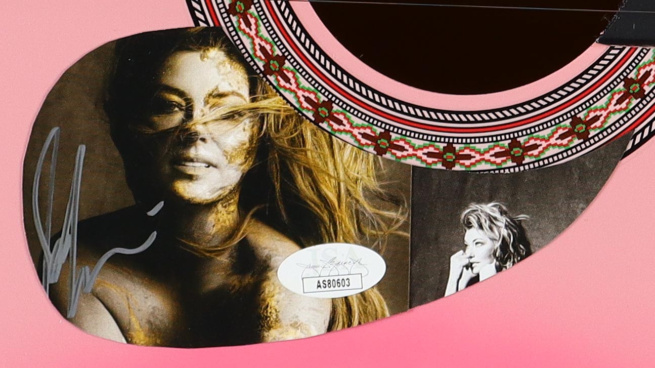 Acoustic guitar measures approximately 39" in length and has been hand-signed by Shania Twain on a CD insert that has been repurposed as the pickguard.
