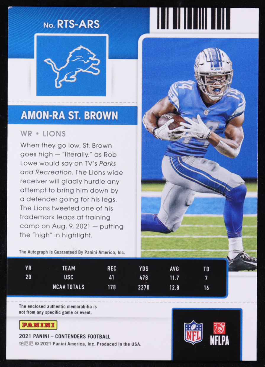 Amon-Ra St. Brown 2021 Panini Contenders Rookie Ticket Swatch Autographs #31 RC