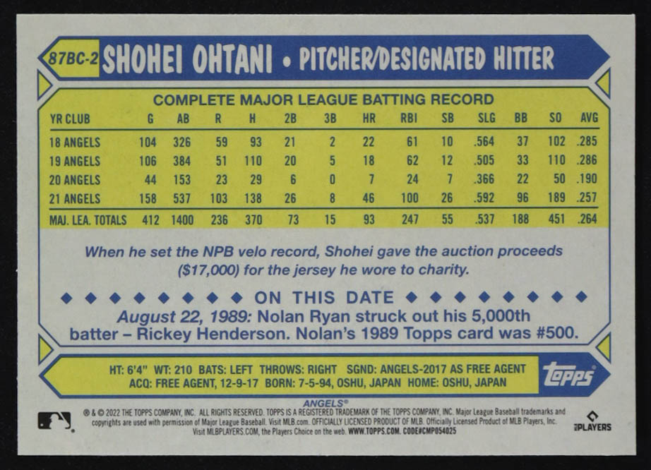 Shohei Ohtani 2022 Topps Chrome '87 Topps #87BC2
