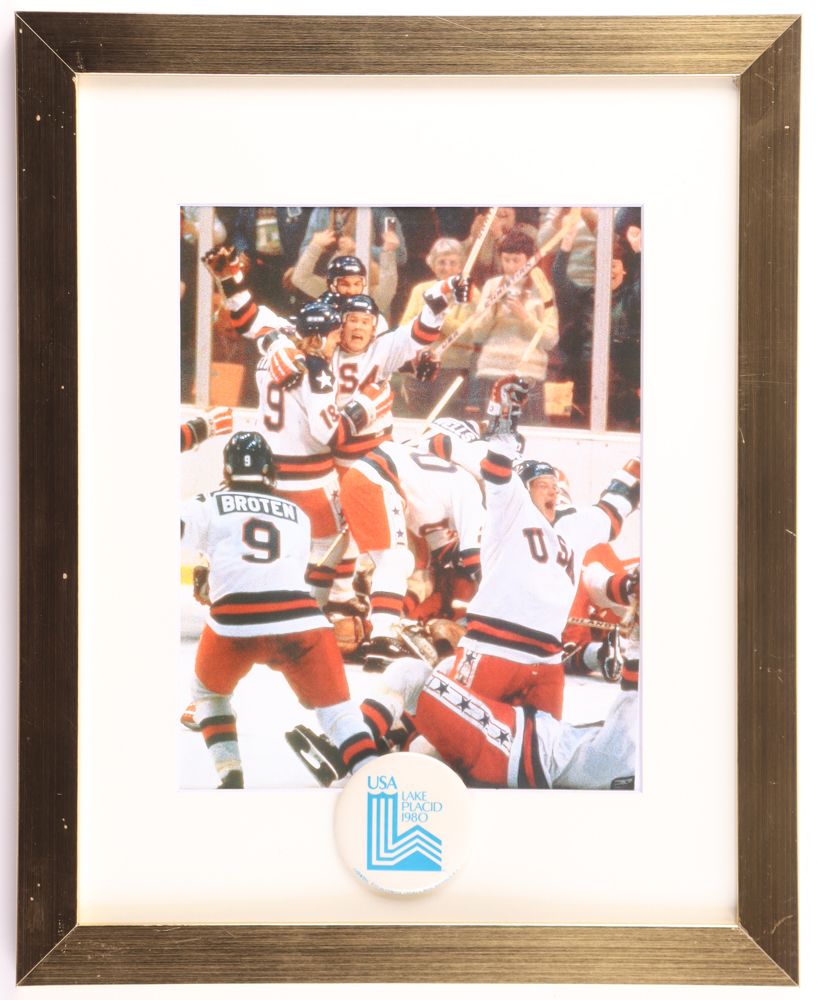 Custom frame measures 12.5" x 15.5" in size featuring an 8" x 10" photo. Please see photos for details regarding the item. Display also includes a 1980 Lake Placid lapel pin. Note that the item is unsigned.