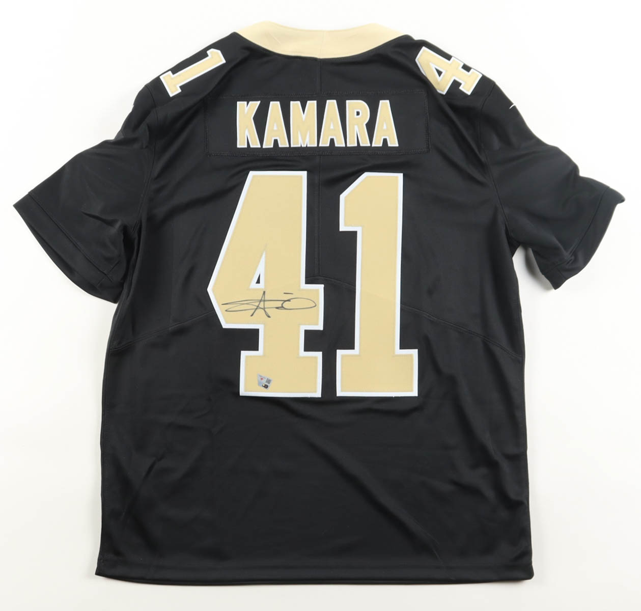 Nike jersey with everything sewn on, size L. Hand-signed by Alvin Kamara (New Orleans Saints).