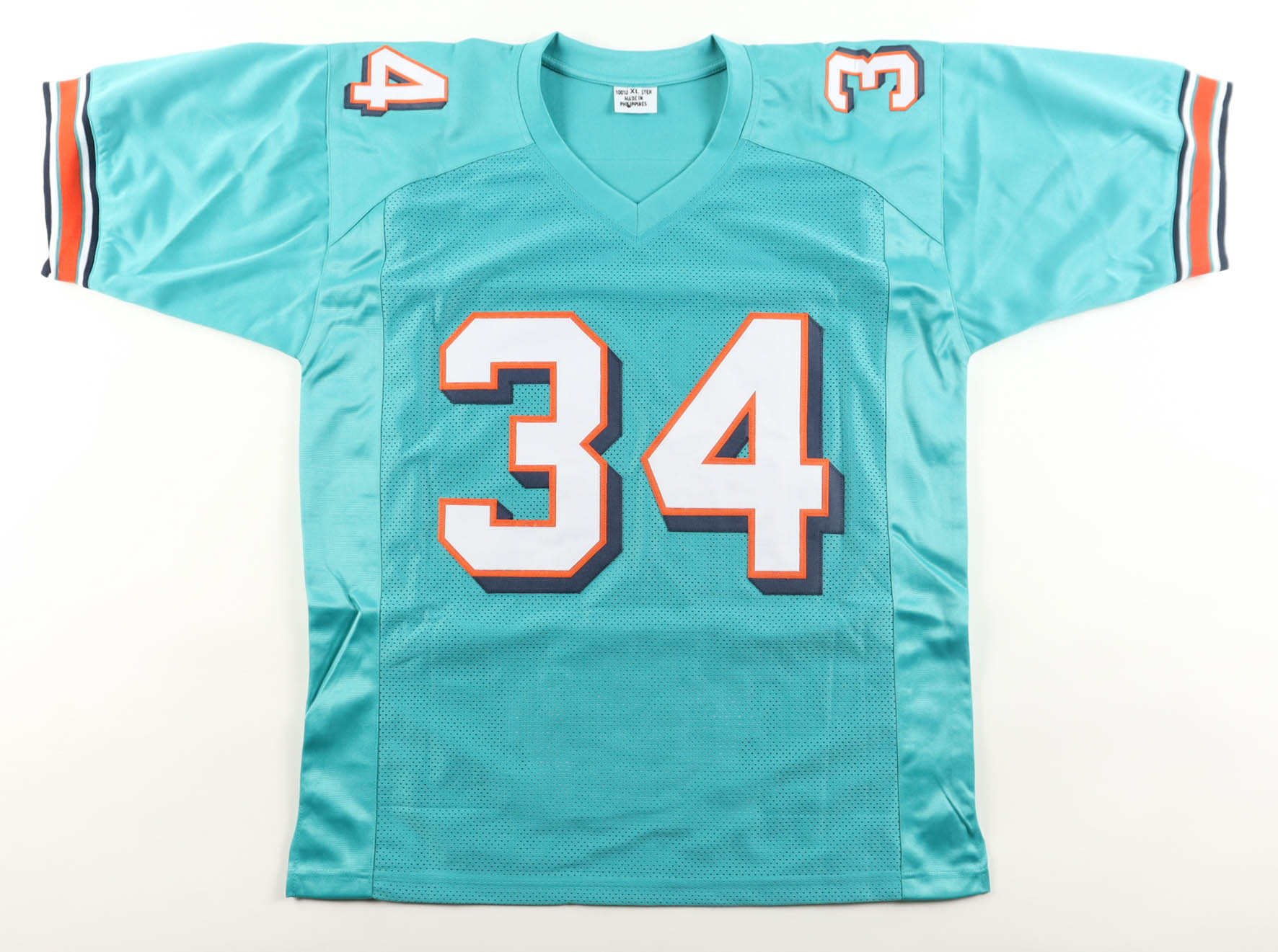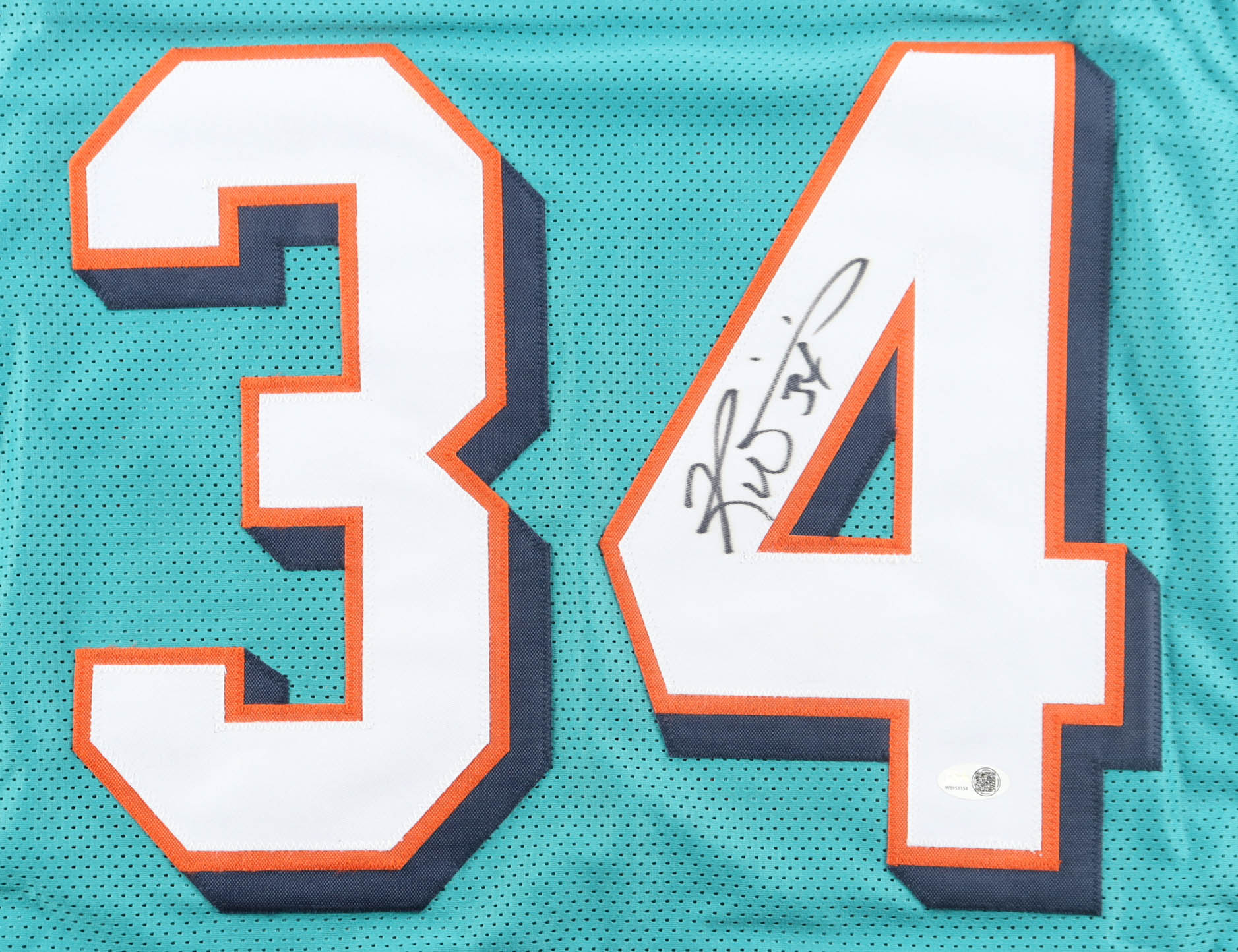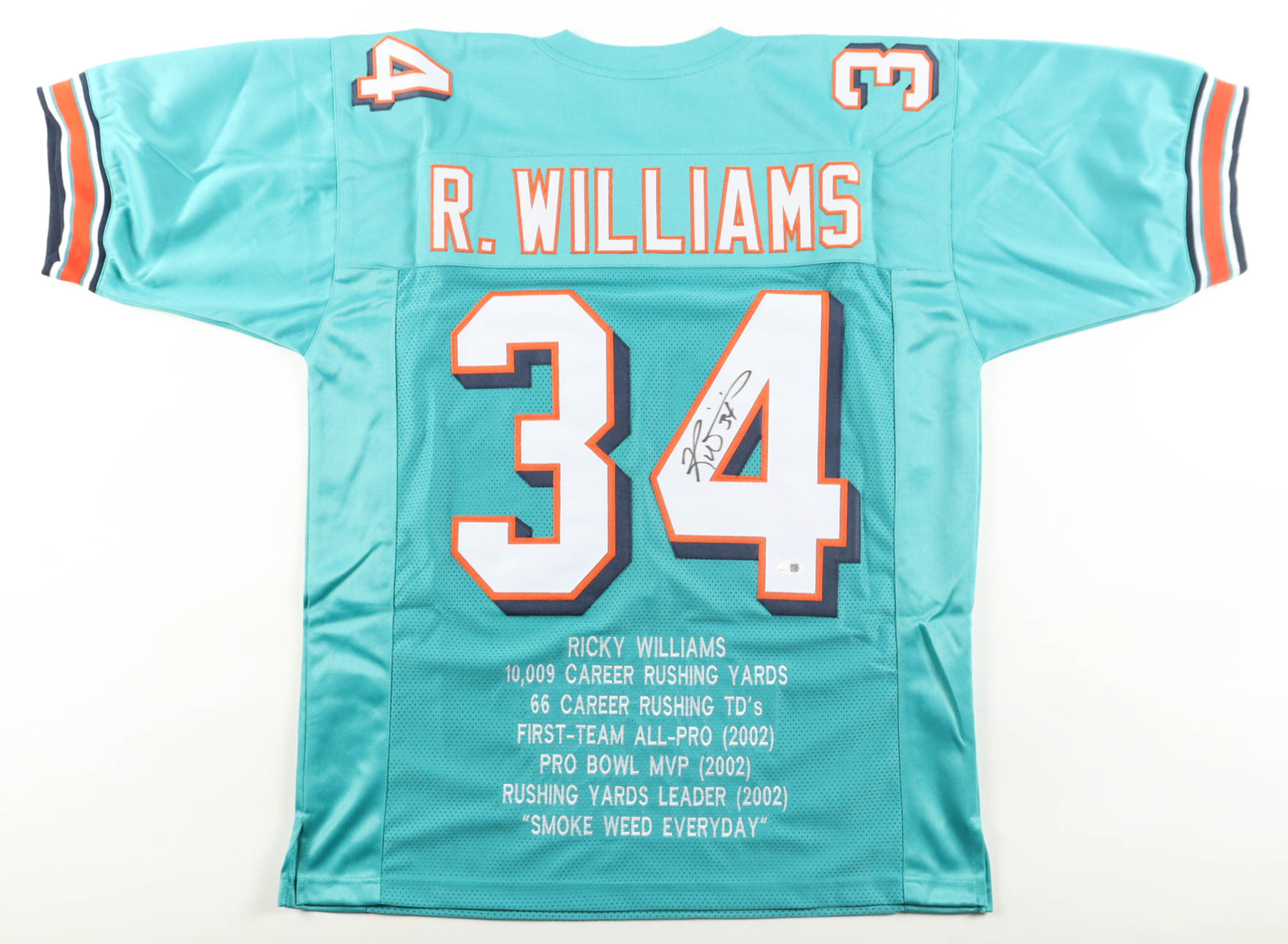 Custom jersey with everything sewn on, size XL. Has been hand-signed by Ricky Williams. Williams's career highlights have been custom stitched onto the back of the jersey below the reverse numbers.