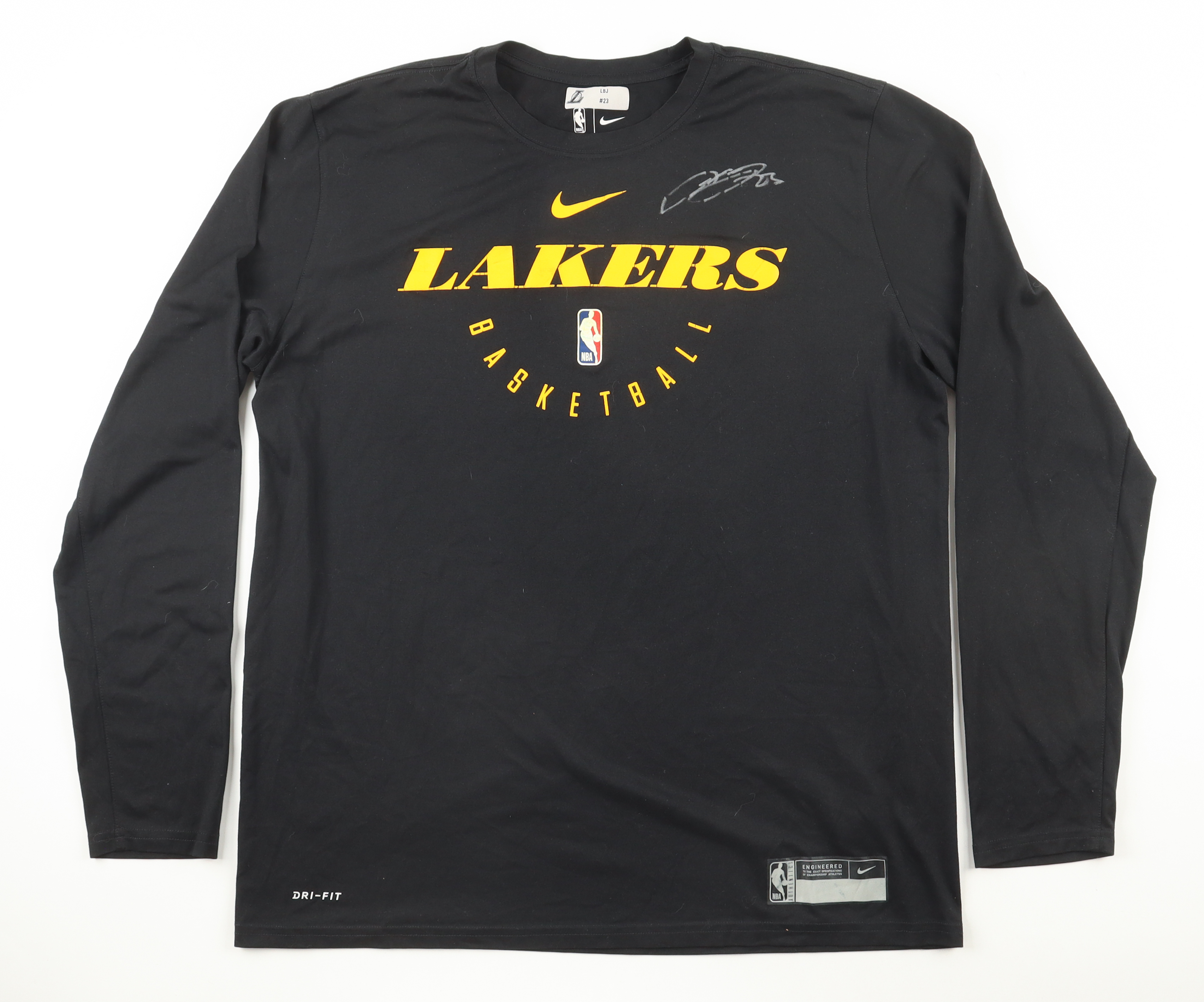 Nike Dri-Fit warm-up shirt has been hand-signed and worn by basketball legend, LeBron James! This shirt was worn during the 2018-19 season and shows moderate wear. Please note, the LBJ #23 team decal is applied in collar.