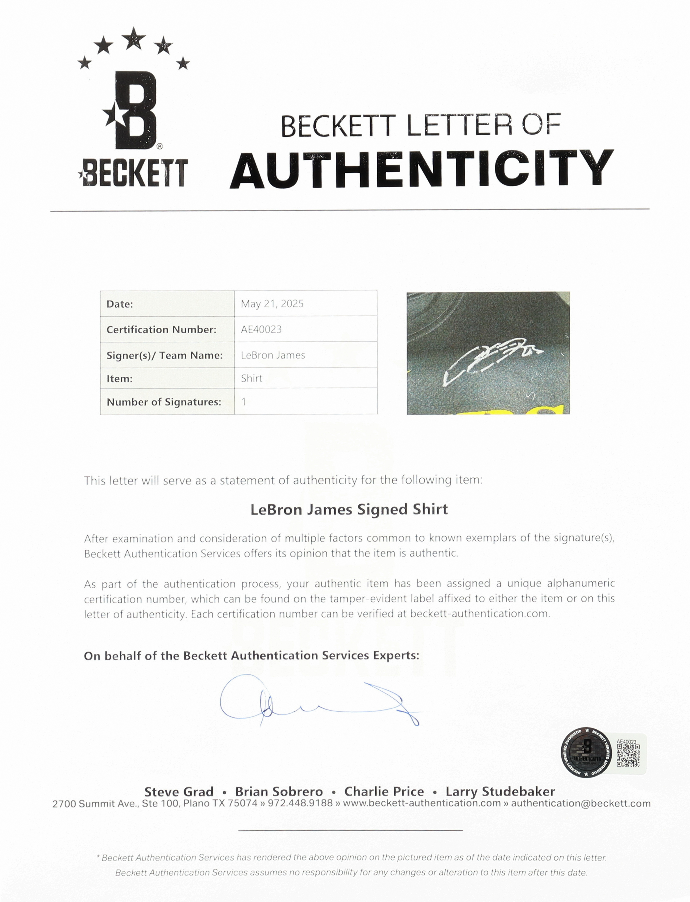 The shirt includes an official Beckett Authentication Services hologram and matching LOA for authenticity purposes. The worn basketball warm-up shirt include an official MEARS LOA for authenticity purposes.